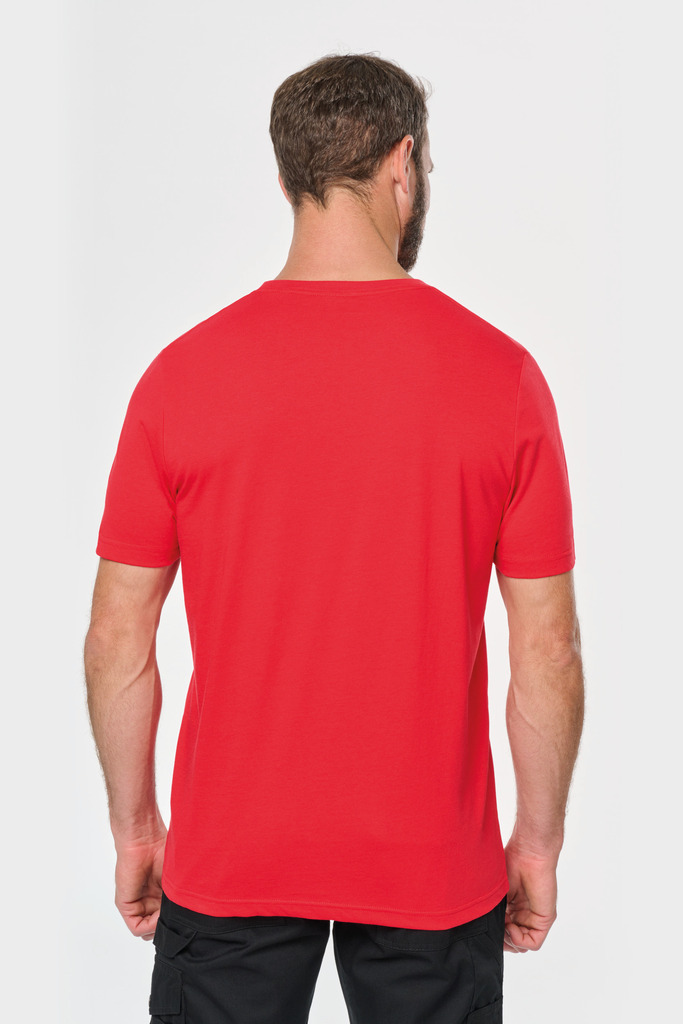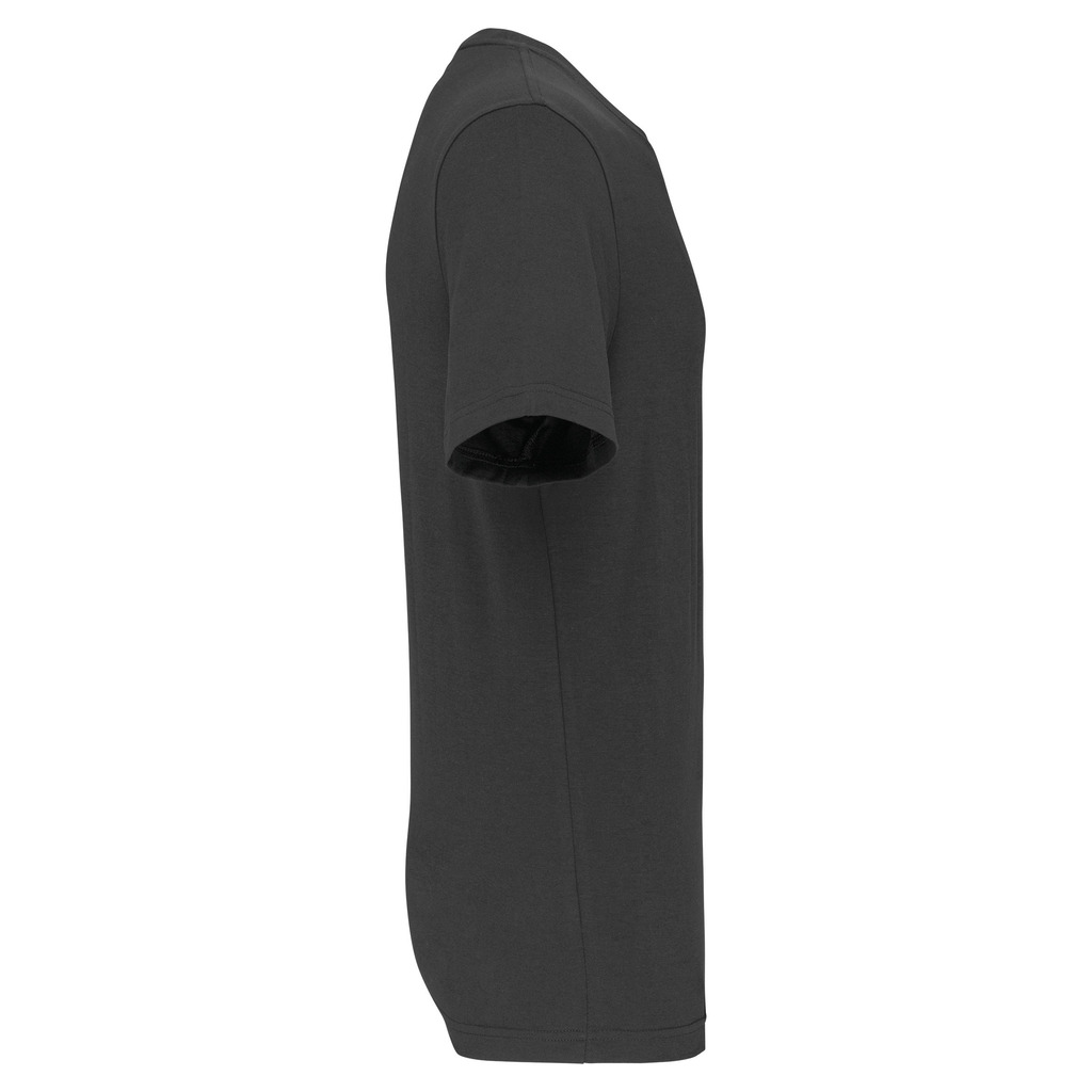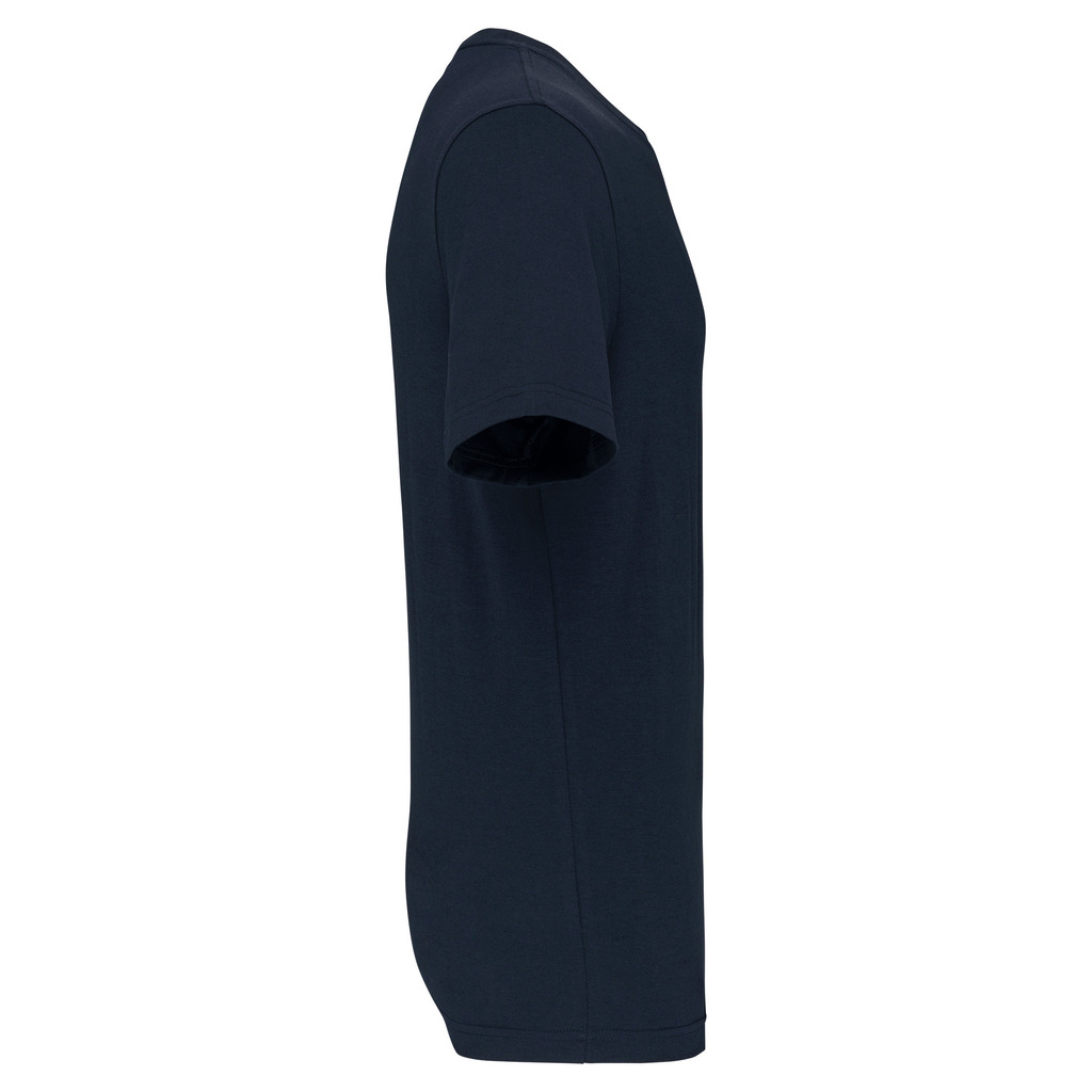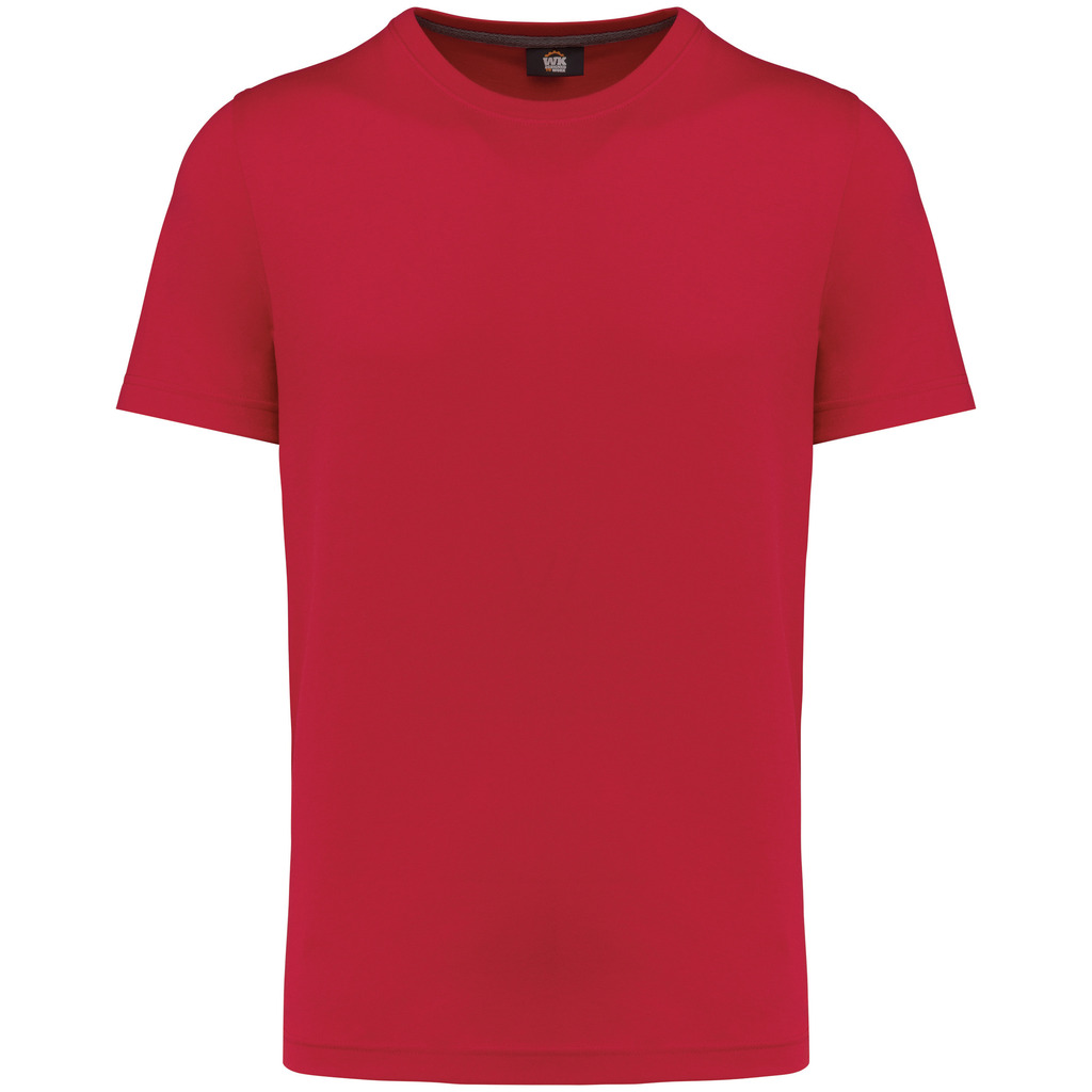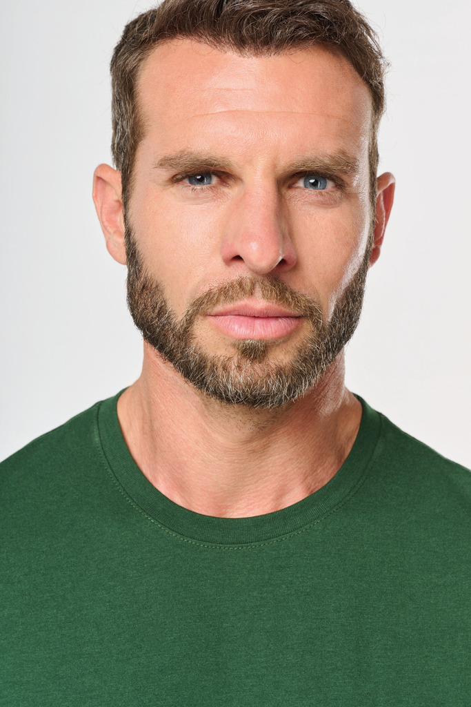 Cores lisas: 60% algodão biológico/40% poliéster reciclado. Cor Oxford Grey: 90% algodão biológico/10% viscose. Tecido suave, com banho de enzimas. Lavável a 60 °C. Forma corte direito. Decote redondo com acabamento em malha rib 1 x 1. Tapa-costuras em contraste cor de laranja no decote (prolongamento costas/ombro, excepto para a cor branca). Costura reforçada nos ombros. Etiqueta de marca «tearaway» para facilitar a personalização.
