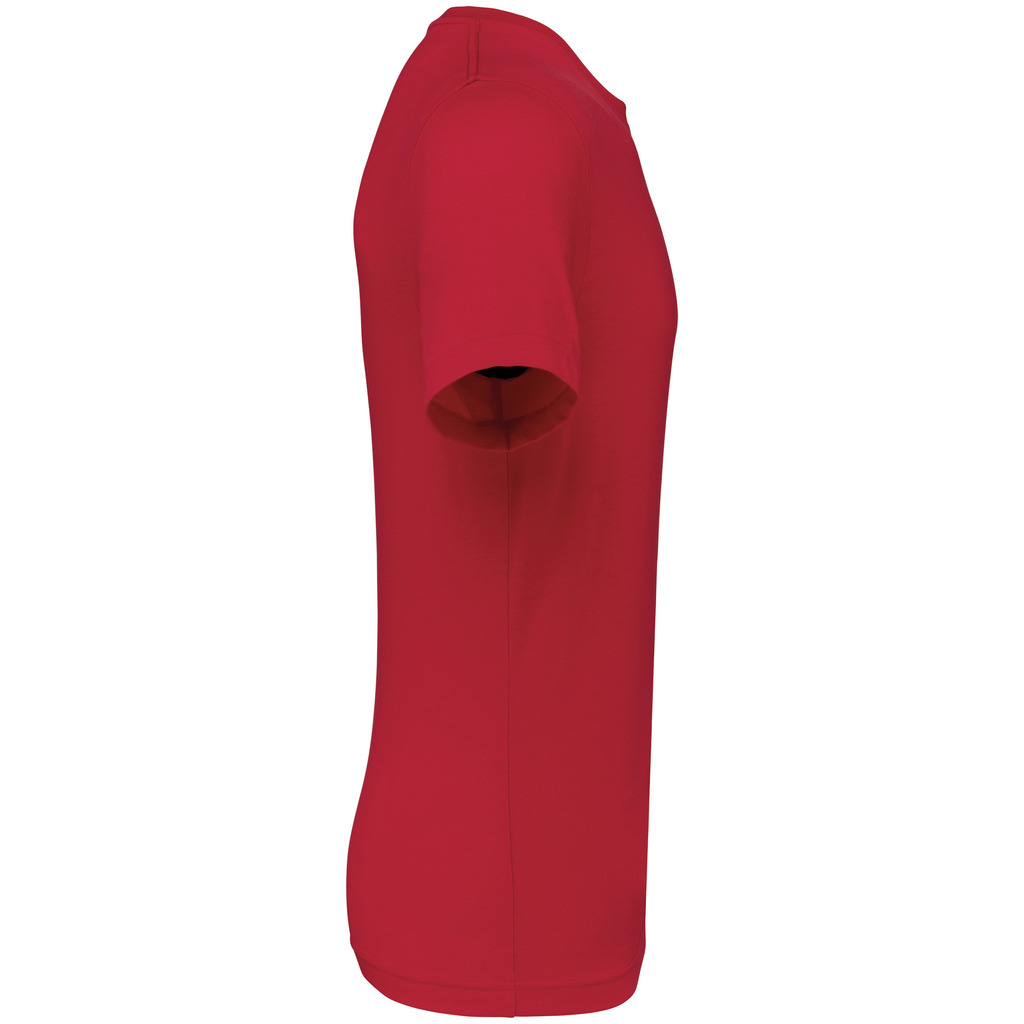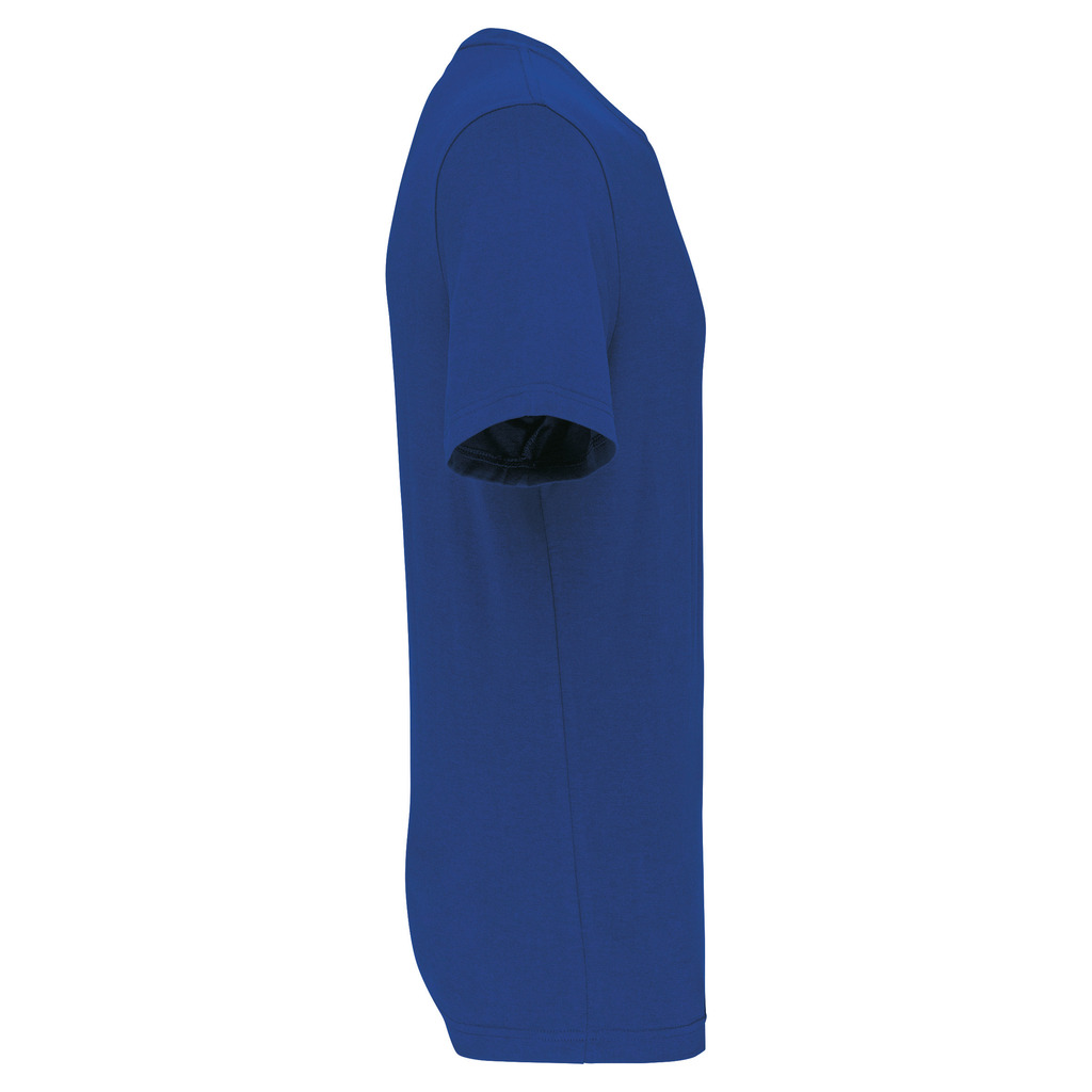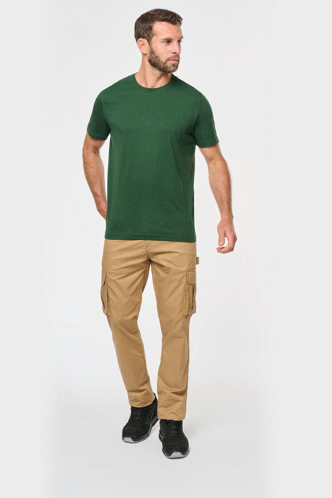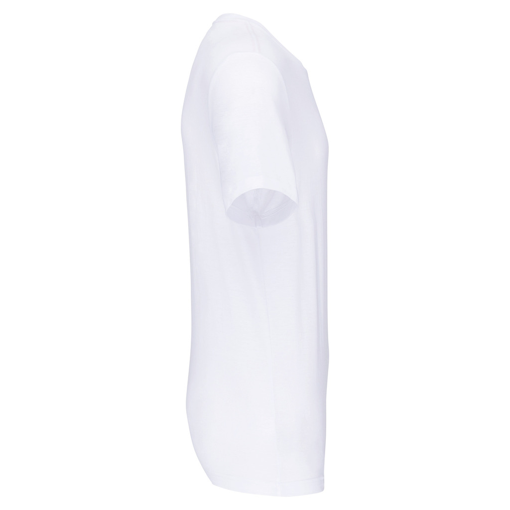 Cores lisas: 60% algodão biológico/40% poliéster reciclado. Cor Oxford Grey: 90% algodão biológico/10% viscose. Tecido suave, com banho de enzimas. Lavável a 60 °C. Forma corte direito. Decote redondo com acabamento em malha rib 1 x 1. Tapa-costuras em contraste cor de laranja no decote (prolongamento costas/ombro, excepto para a cor branca). Costura reforçada nos ombros. Etiqueta de marca «tearaway» para facilitar a personalização.