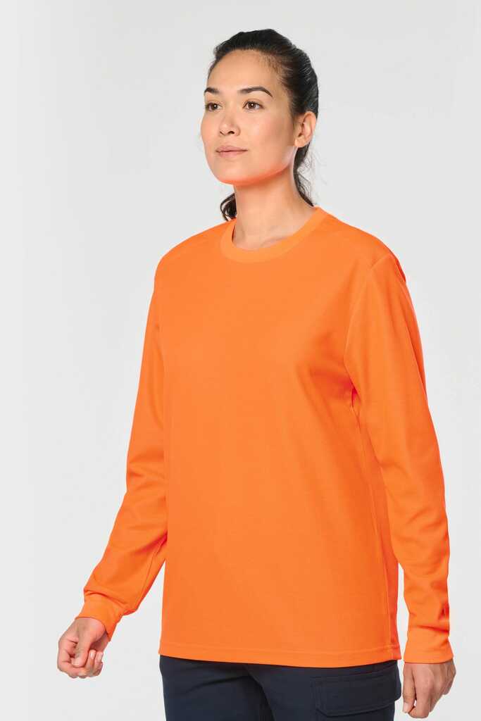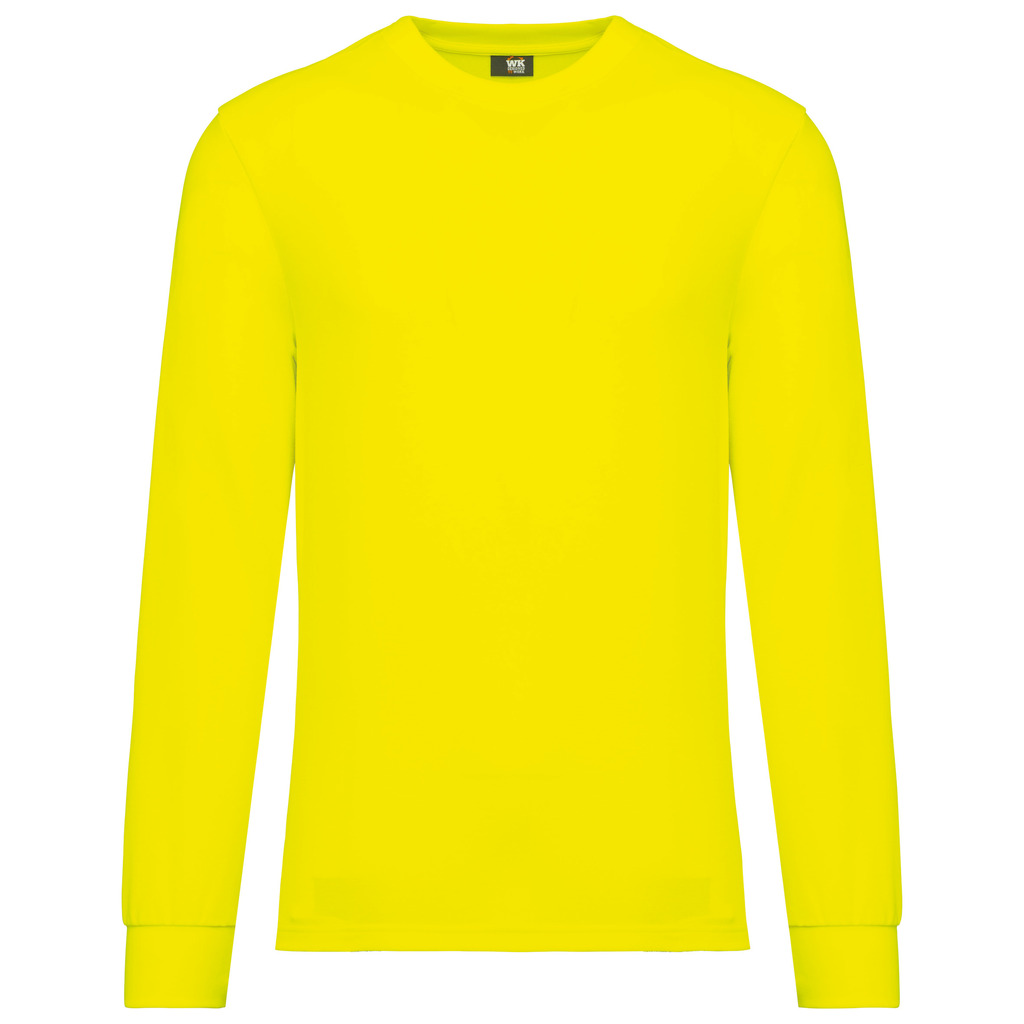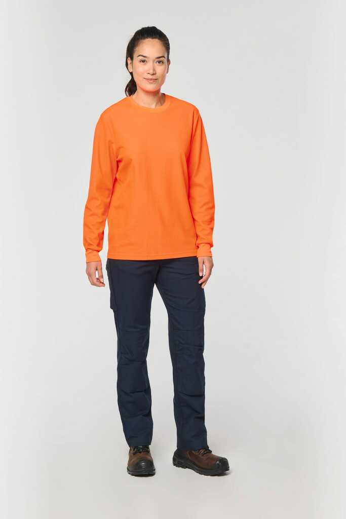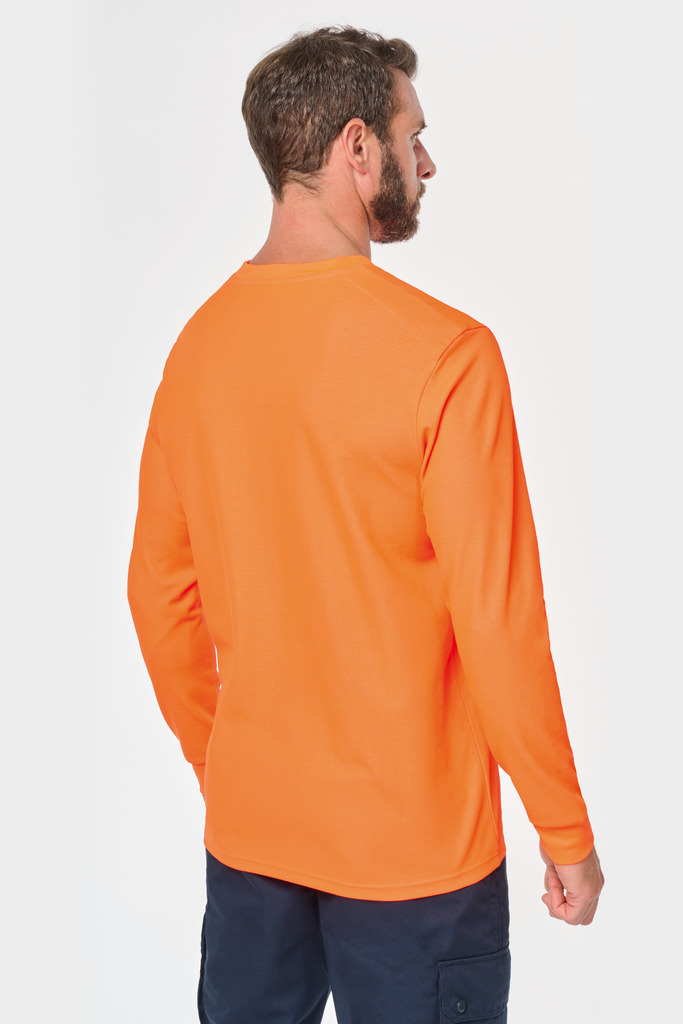 60% algodão penteado/40% poliéster reciclado. Malha piqué interlock. Lavagem industrial e/ou lavagem doméstica a 60°C. Corte confortável. Decote e punhos em malha rib duplo 1×1. Tapa-costuras no interior do decote. Reforços interiores dos ombros em tecido em twill 65% poliéster/35% algodão, para evitar a deformação durante a lavagem industrial. Bolsa RFID na parte inferior abaixo da etiqueta. Acabamento costura dupla nas mangas e na bainha. EPI Classe II – Normas NF EN ISO 13688:2013 + NF EN ISO 13688/A1:2021 (Vestuário de protecção – Requisitos gerais), NF EN 17353:2020: Tipo A (Vestuário de protecção – Equipamento de visibilidade melhorada para situações de risco moderado – Métodos de ensaio e requisitos), NF EN ISO 15797:2018 (Têxteis – Métodos de lavagem e acabamento industrial para o ensaio de vestuário de trabalho): Lavagem industrial profissional – Programa do método de lavagem 8 apenas com acabamento no túnel de secagem. Etiqueta de marca tecida.
