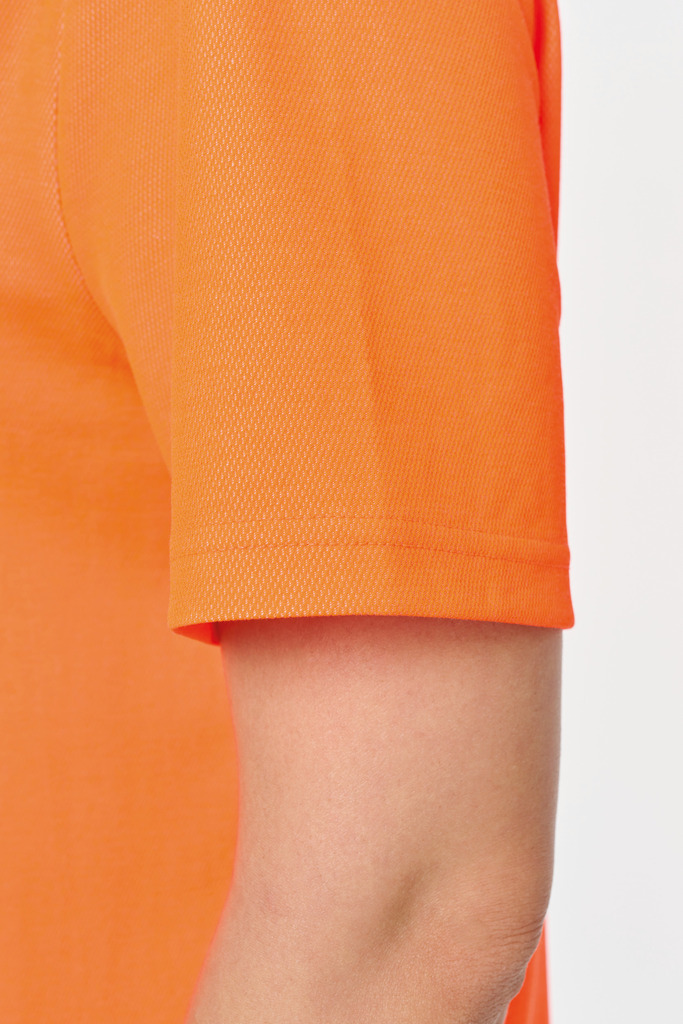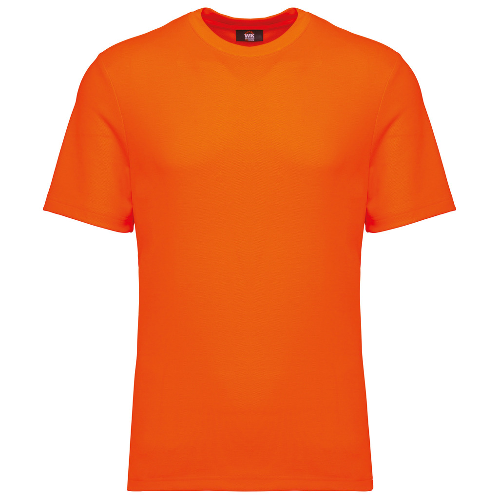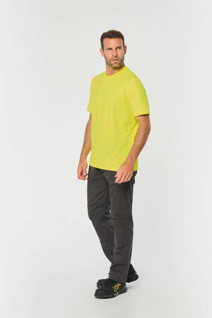 60% algodão penteado/40% poliéster reciclado. Malha piqué interlock. Lavagem industrial e/ou lavagem doméstica a 60°C. Corte confortável. Decote em malha rib duplo 1×1. Tapa-costuras no interior do decote. Reforços interiores dos ombros em tecido de sarja 65% poliéster/35% algodão, para evitar a deformação durante a lavagem industrial. Bolsa RFID na parte inferior abaixo da etiqueta. Acabamento costura dupla nas mangas e na bainha. EPI Classe II – Normas NF EN ISO 13688:2013 + NF EN ISO 13688/A1:2021 (Vestuário de protecção – Requisitos gerais), NF EN 17353:2020: Tipo A (Vestuário