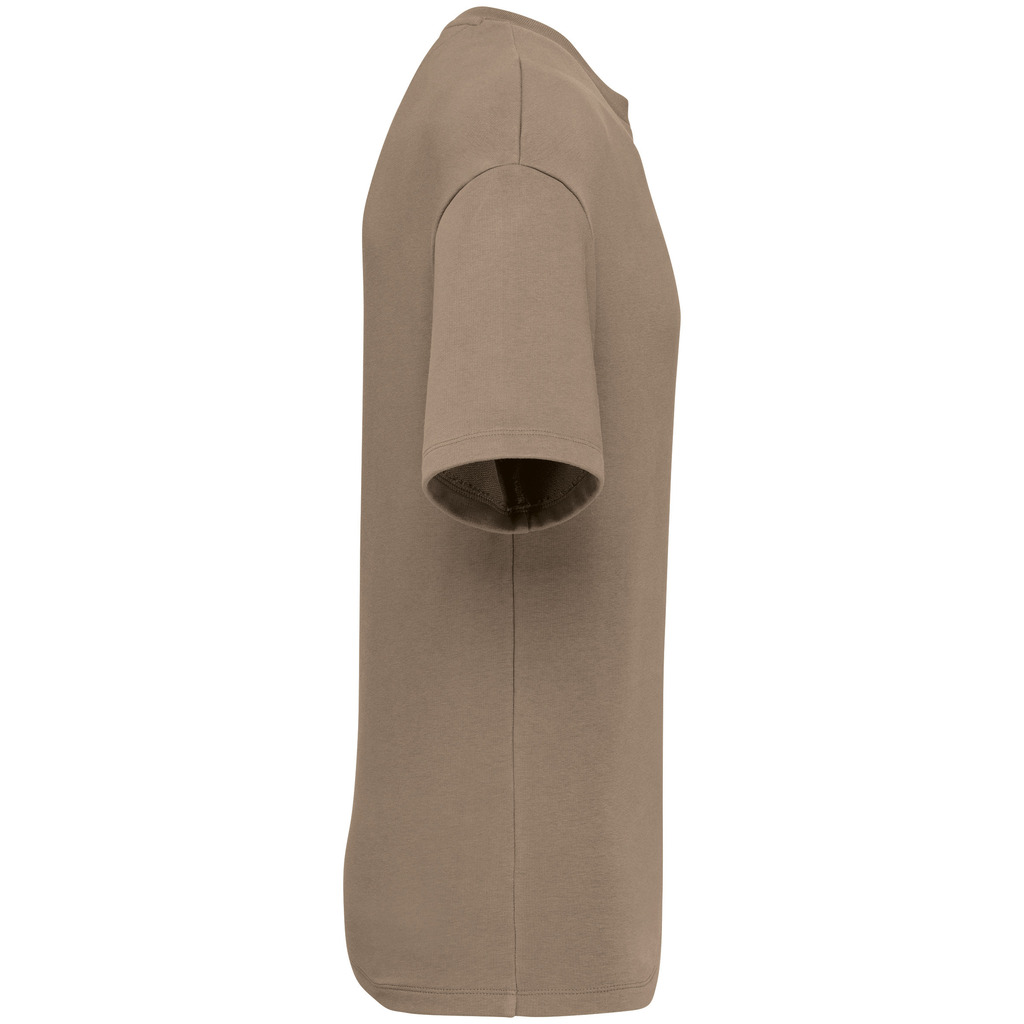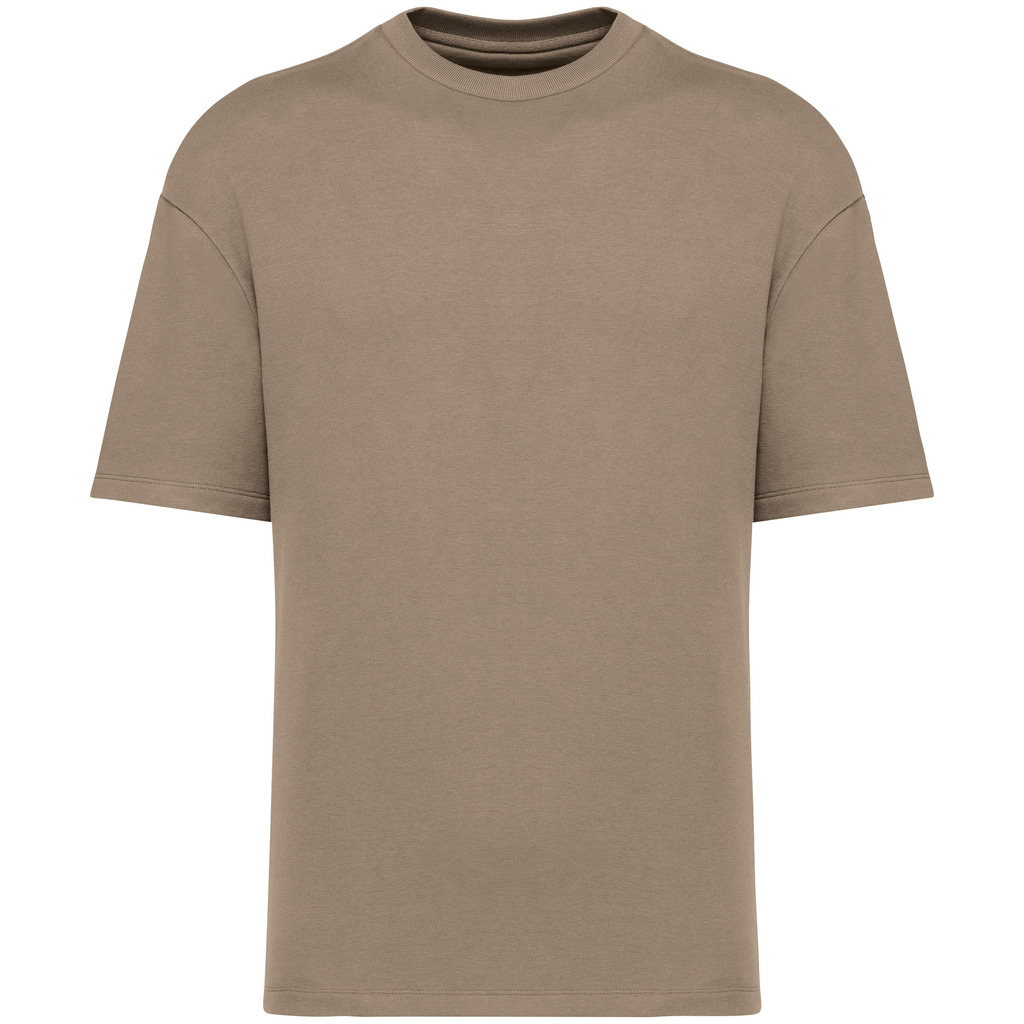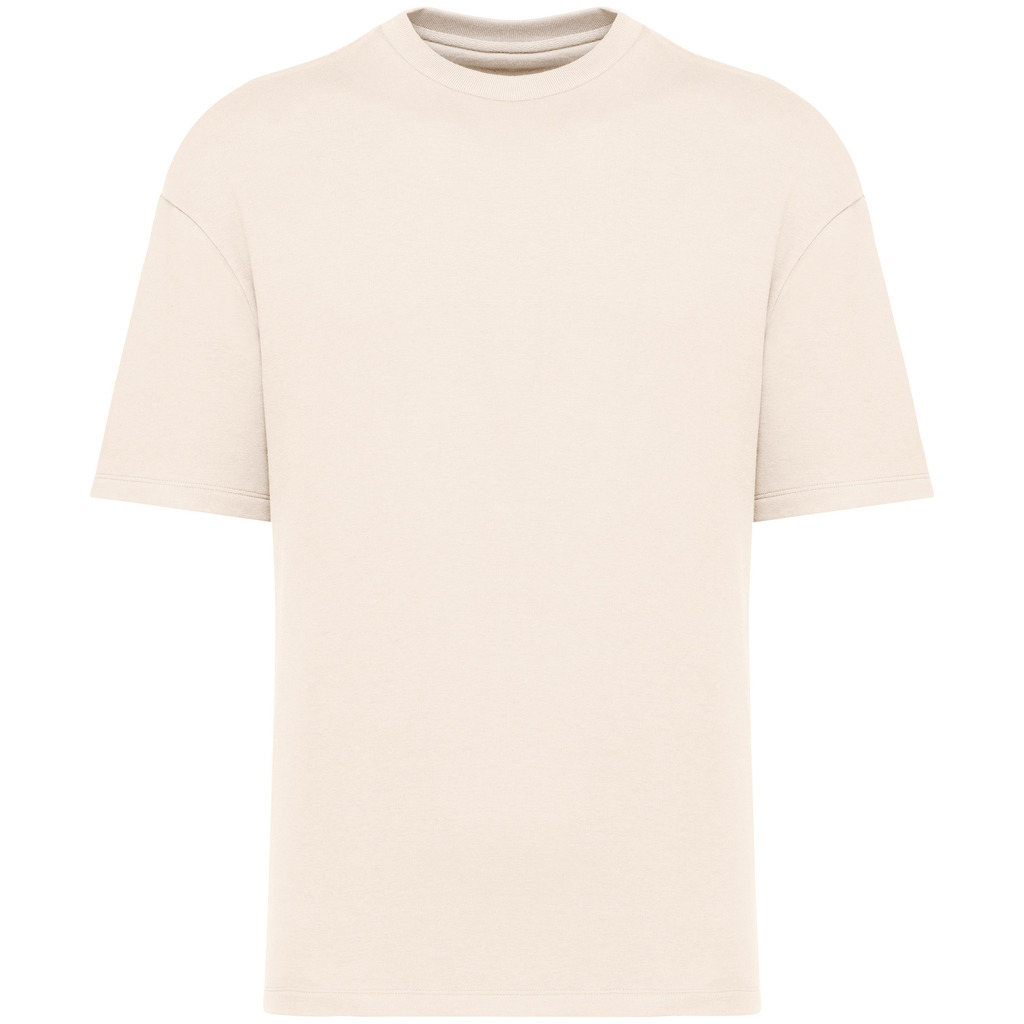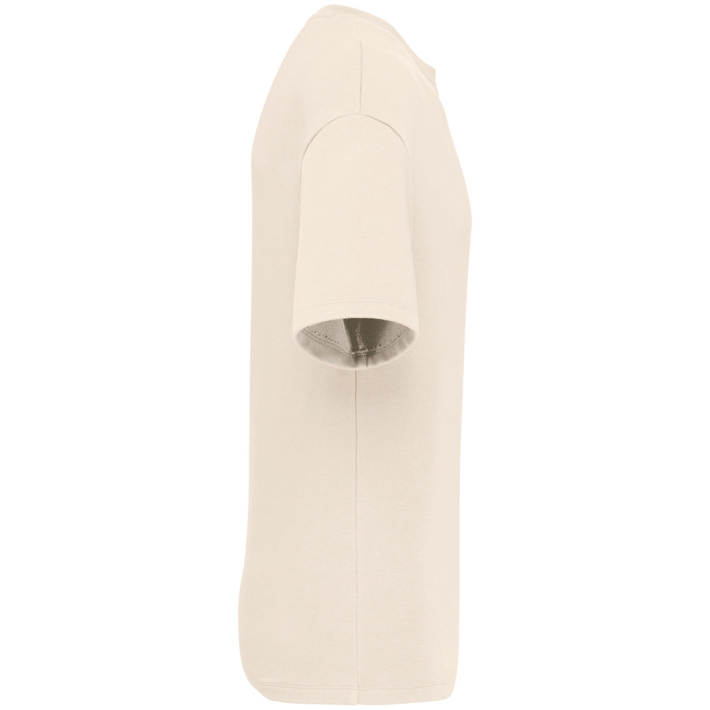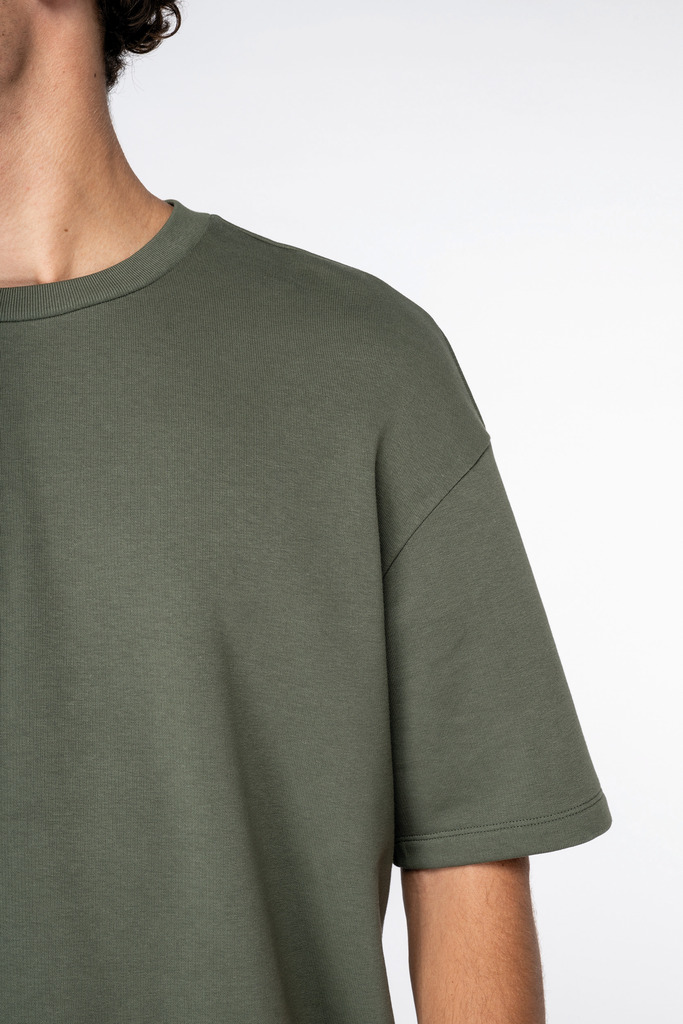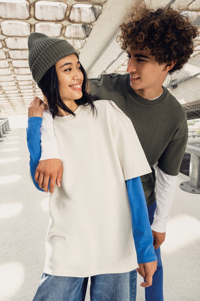 85% algodão biológico/15% poliéster reciclado pós-consumo. Algodão penteado. Corte oversize com ombros descaÃdos. Produto hÃbrido entre uma sweatshirt e uma t-shirt. Interior 3 fios não cardado LST (Low Shrinkage Terry). Meia-lua nas costas. Com banho de enzimas. Decote em malha rib 1 x 1. Acabamento costura dupla nas mangas e na bainha. A cor Raw Natural distingue-se pelo seu aspecto bruto visualmente texturado, salpicada de partÃculas finas visÃveis a olho nu.