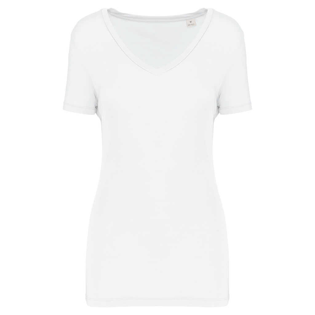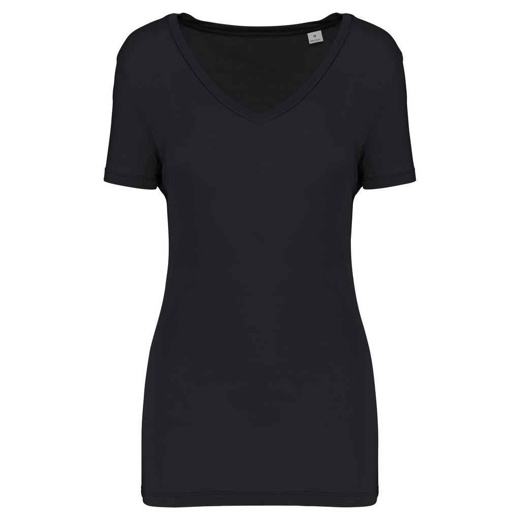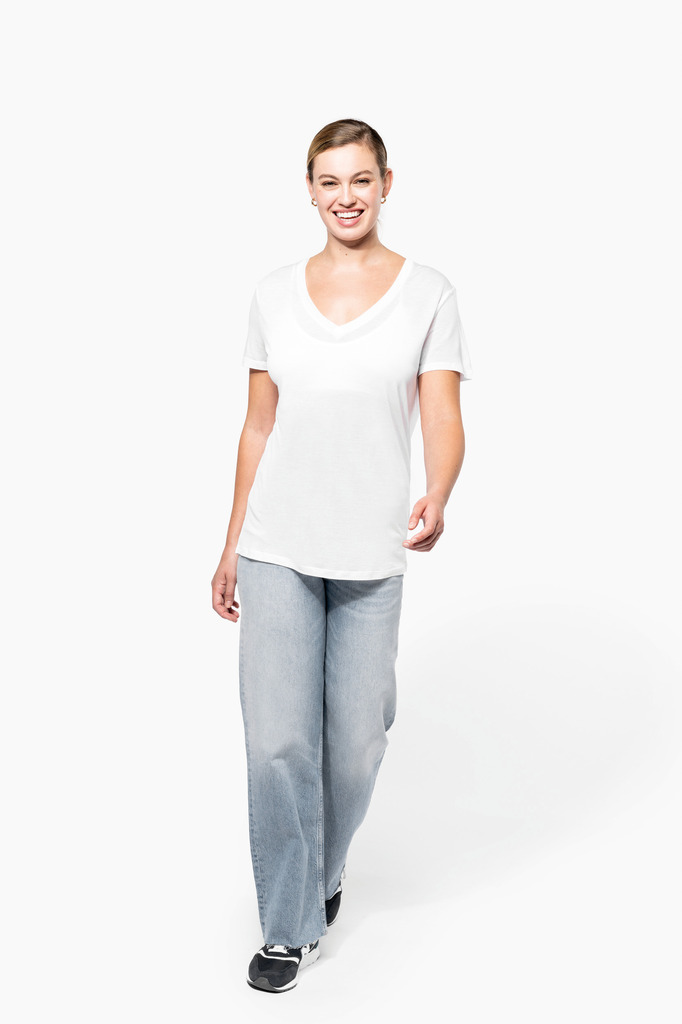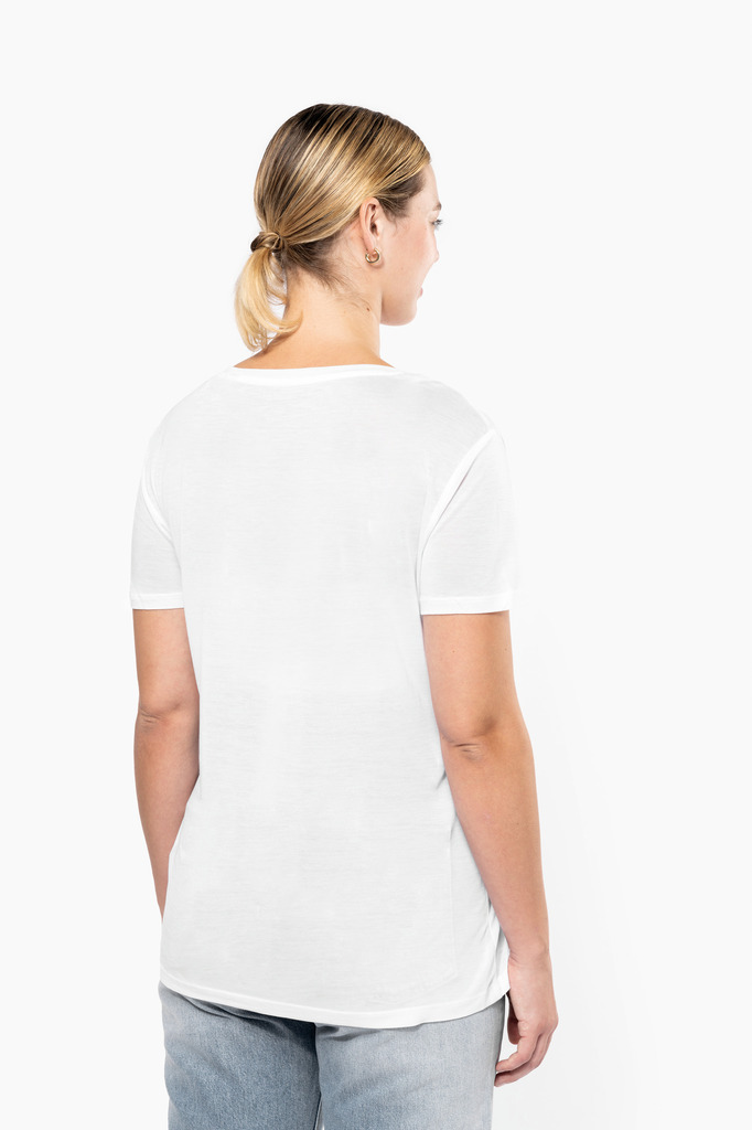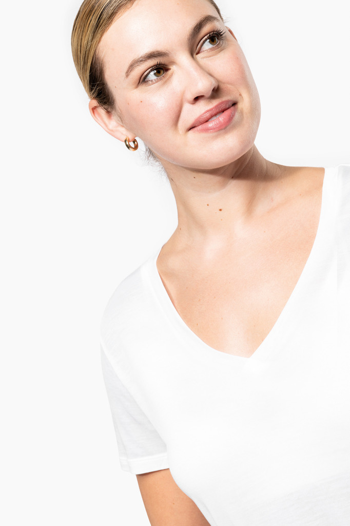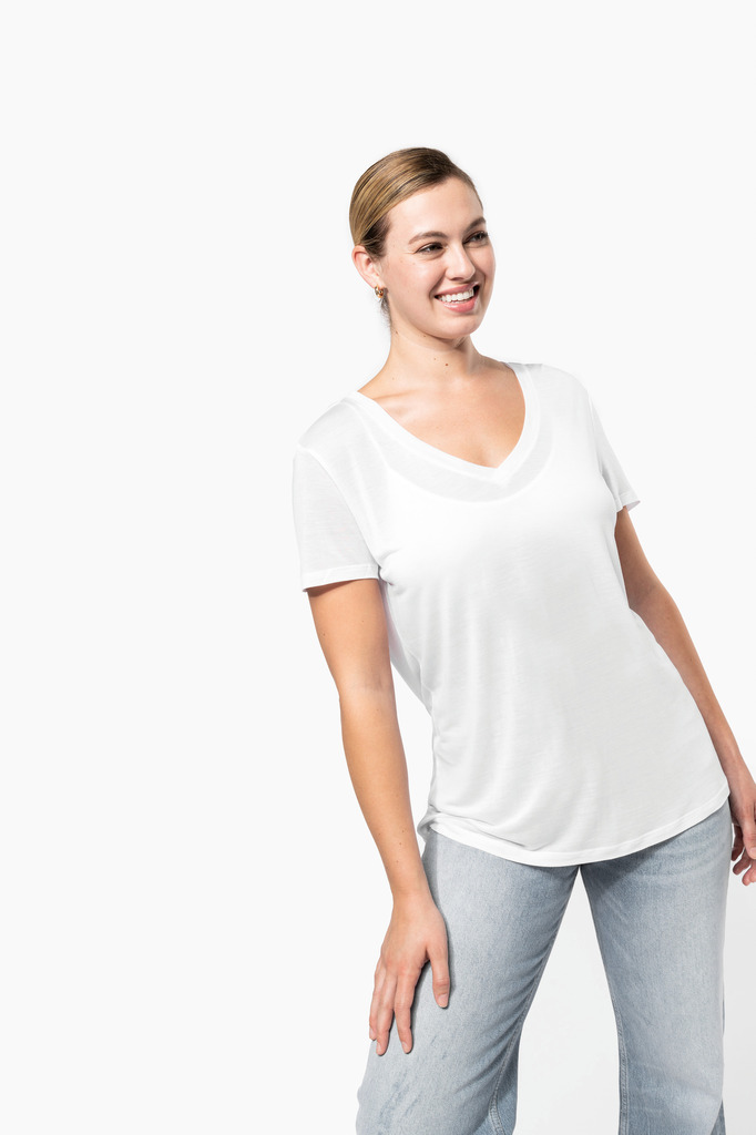 100% Lyocell TENCEL™. Corte direito. Costuras laterais. Banho de enzimas. Decote V no material principal. Tapa-costuras no interior do decote no material principal. Bainha com costura dupla nas mangas e no cós.