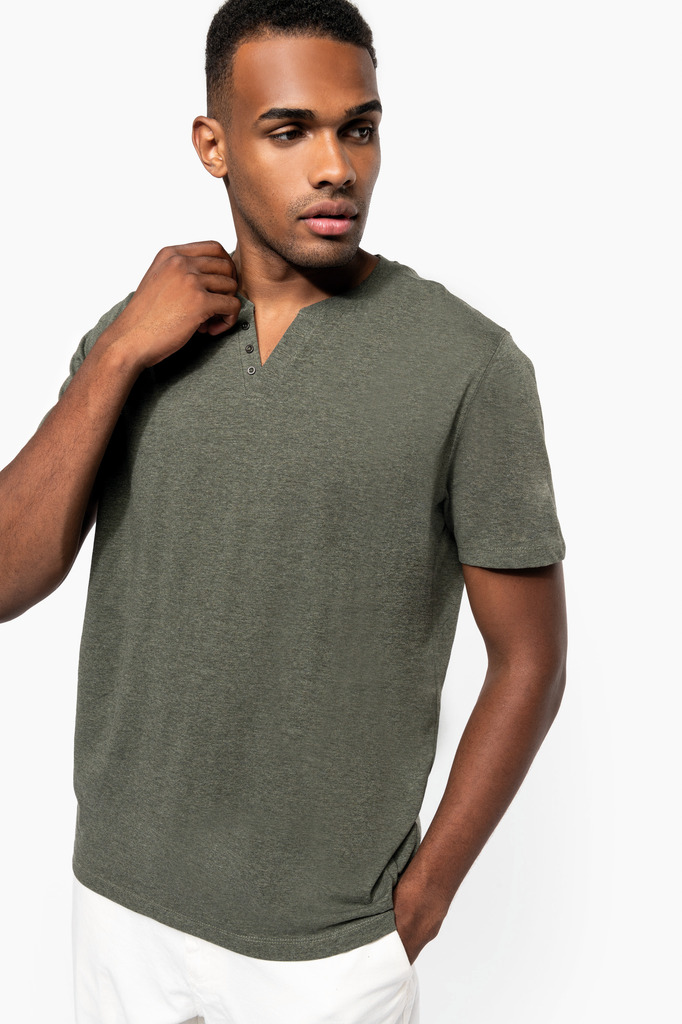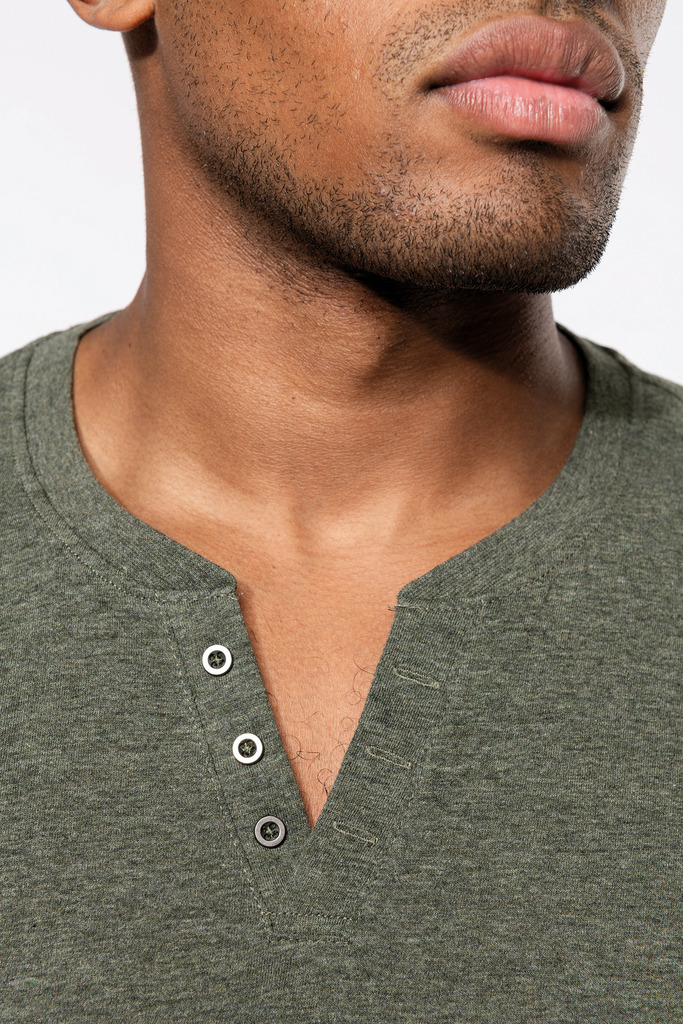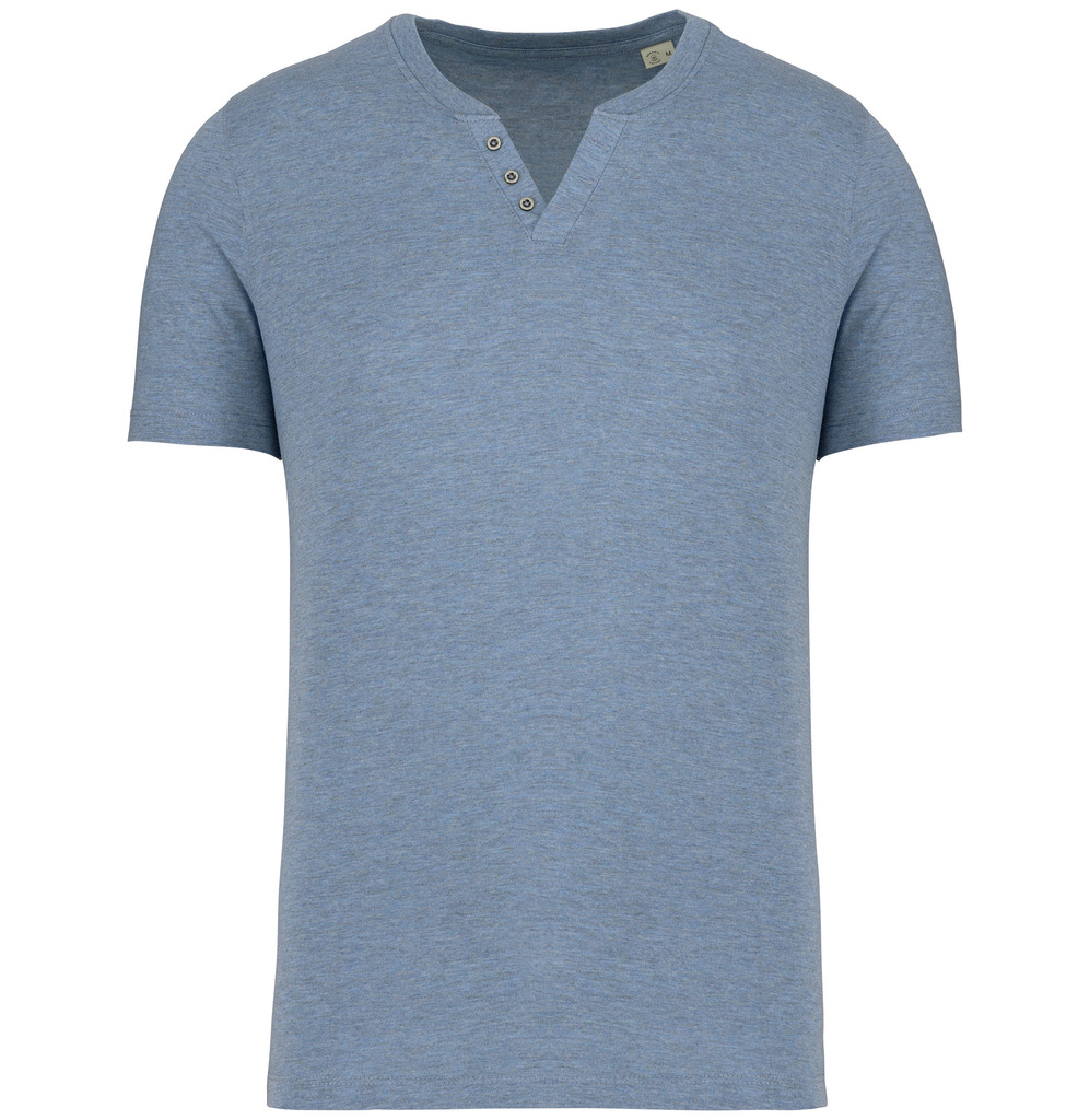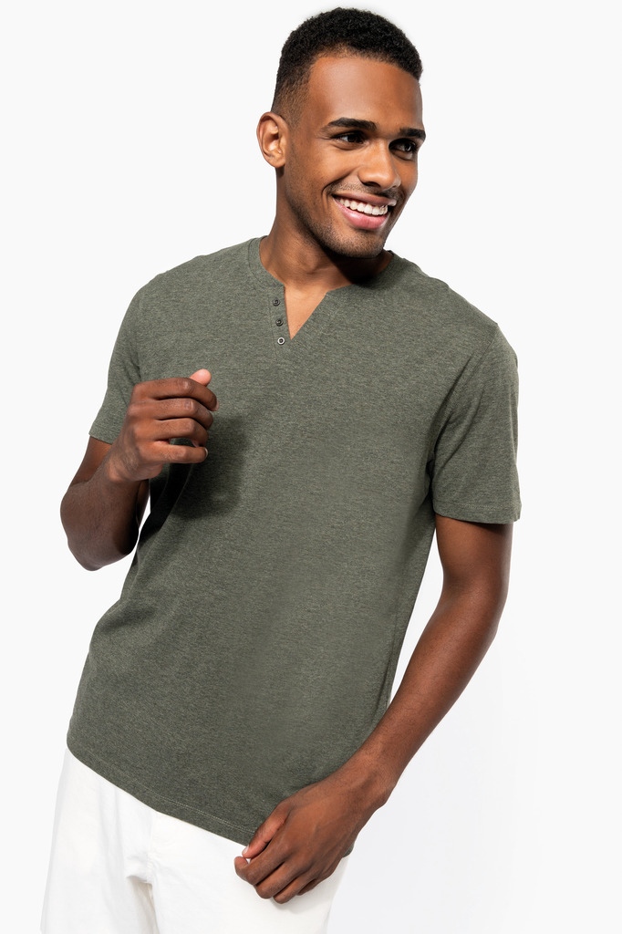 80% algodão biológico/20% poliéster reciclado pós-consumo. Corte direito. Costuras laterais. Decote em malha rib 1 x 1 com carcela com 3 botões metálicos. Tapa-costuras no interior do decote no material principal. Bainha com costura dupla nas mangas e no cós.