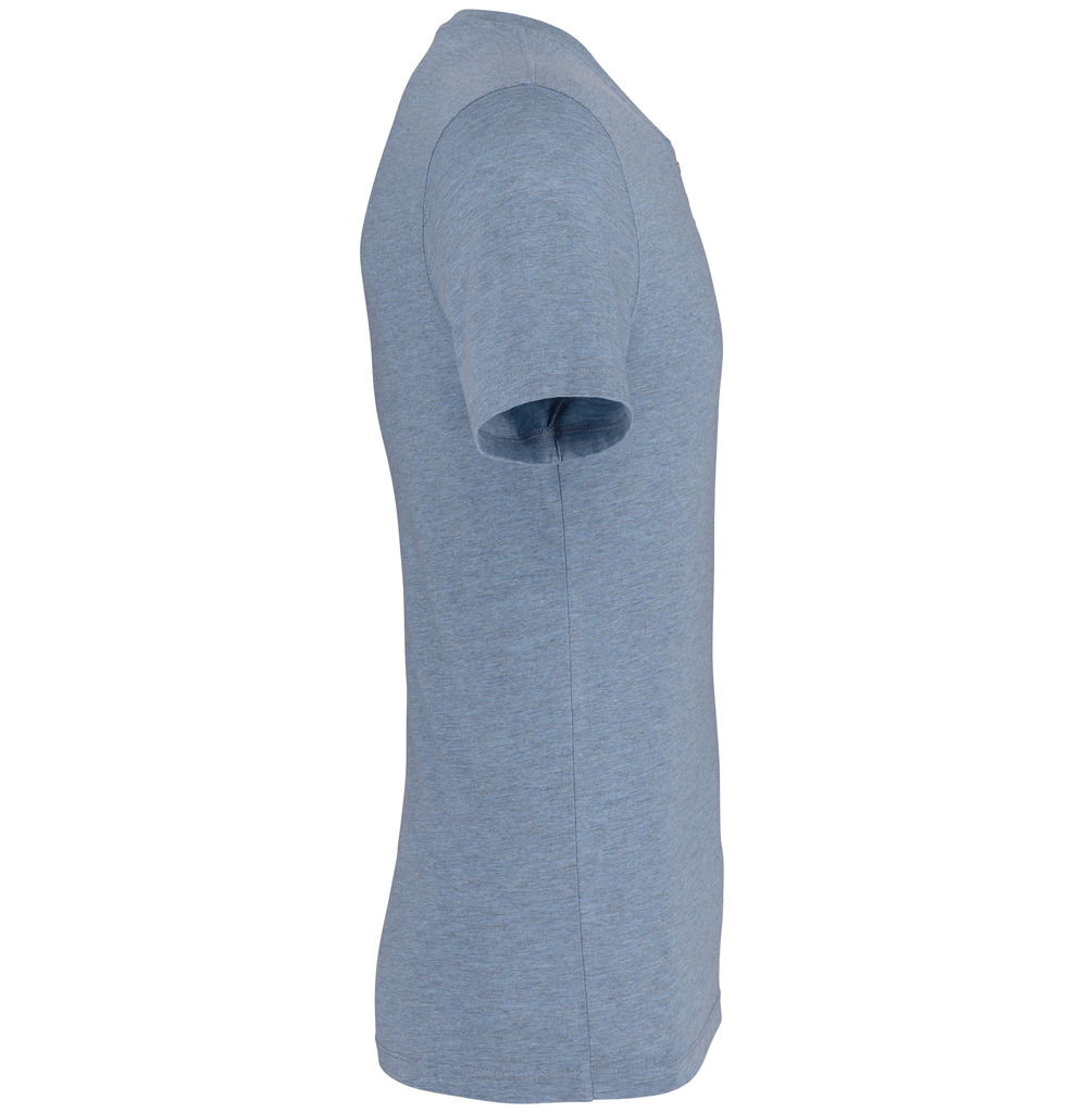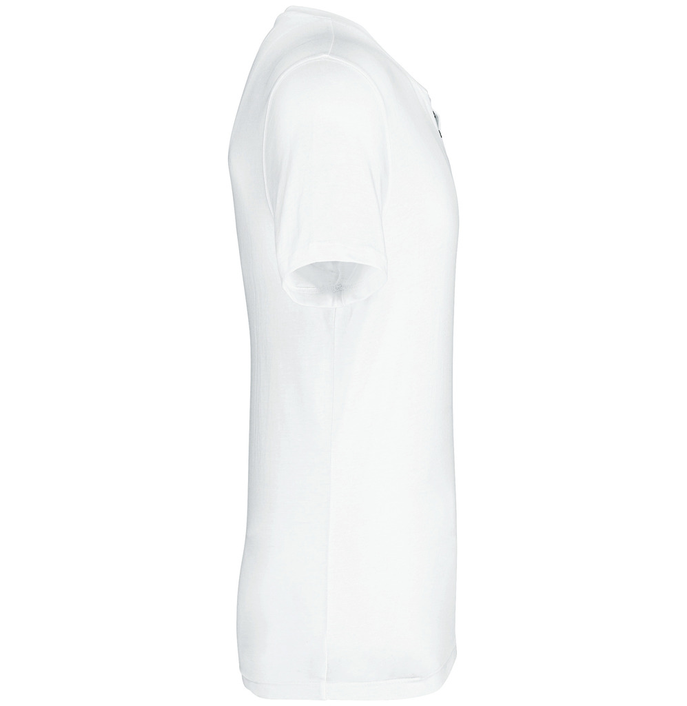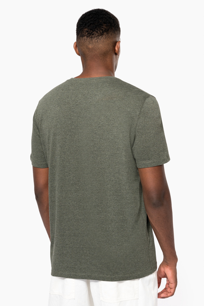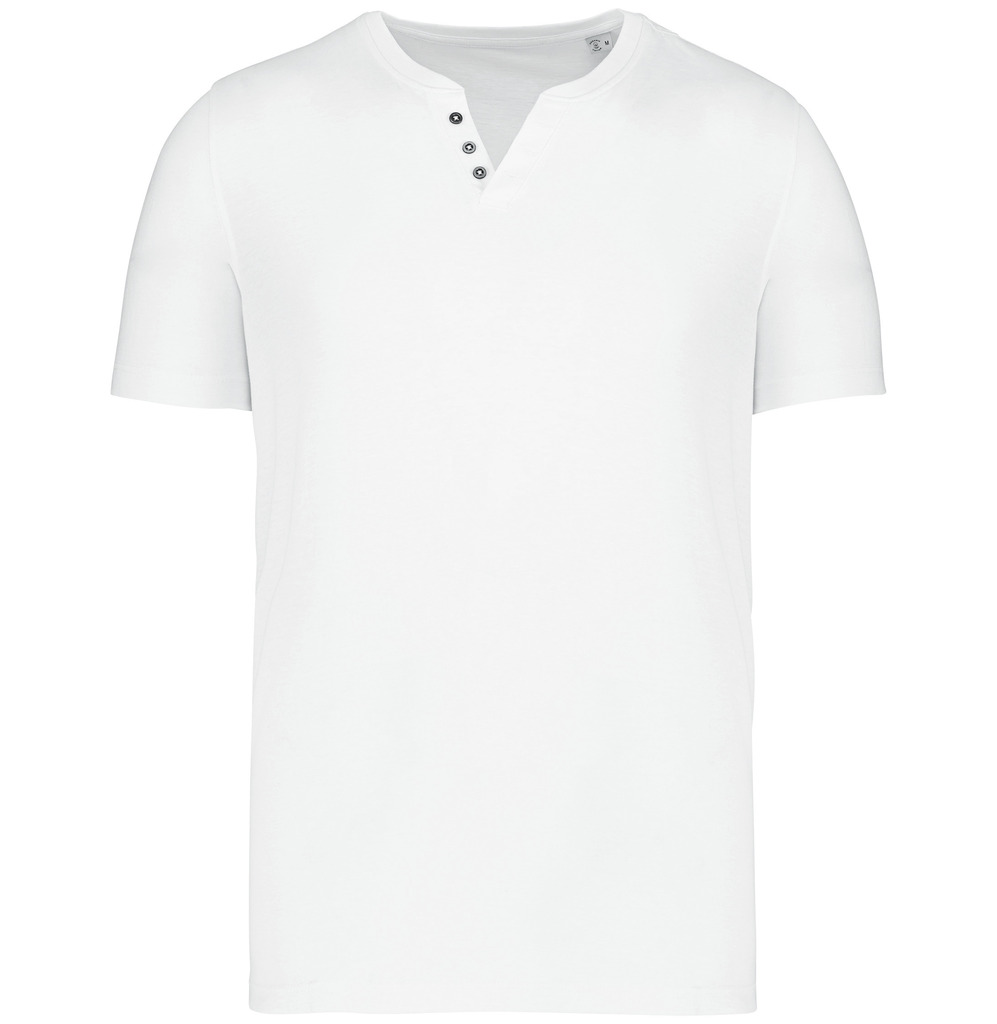80% algodão biológico/20% poliéster reciclado pós-consumo. Corte direito. Costuras laterais. Decote em malha rib 1 x 1 com carcela com 3 botões metálicos. Tapa-costuras no interior do decote no material principal. Bainha com costura dupla nas mangas e no cós.