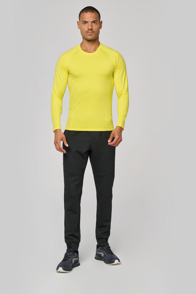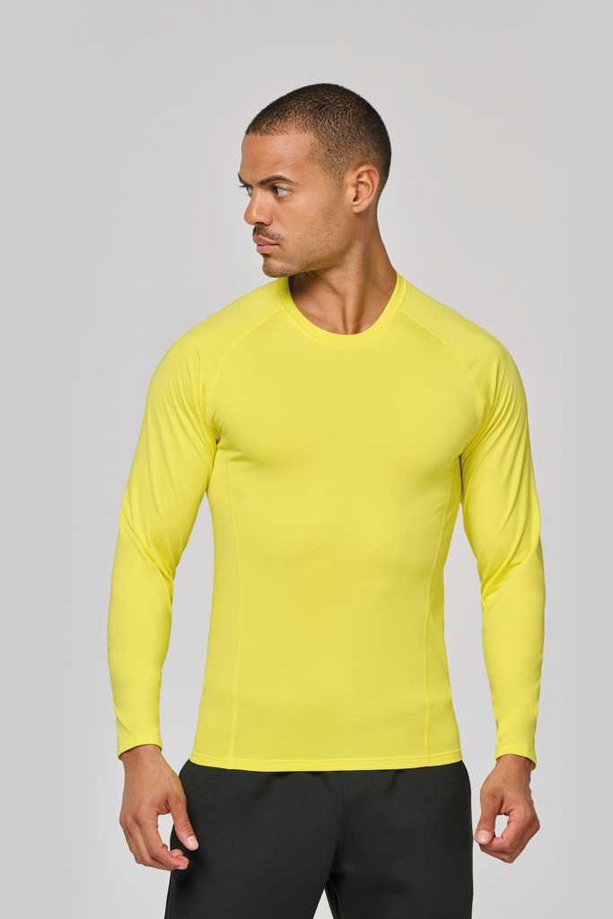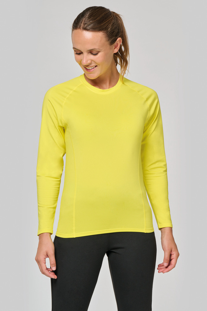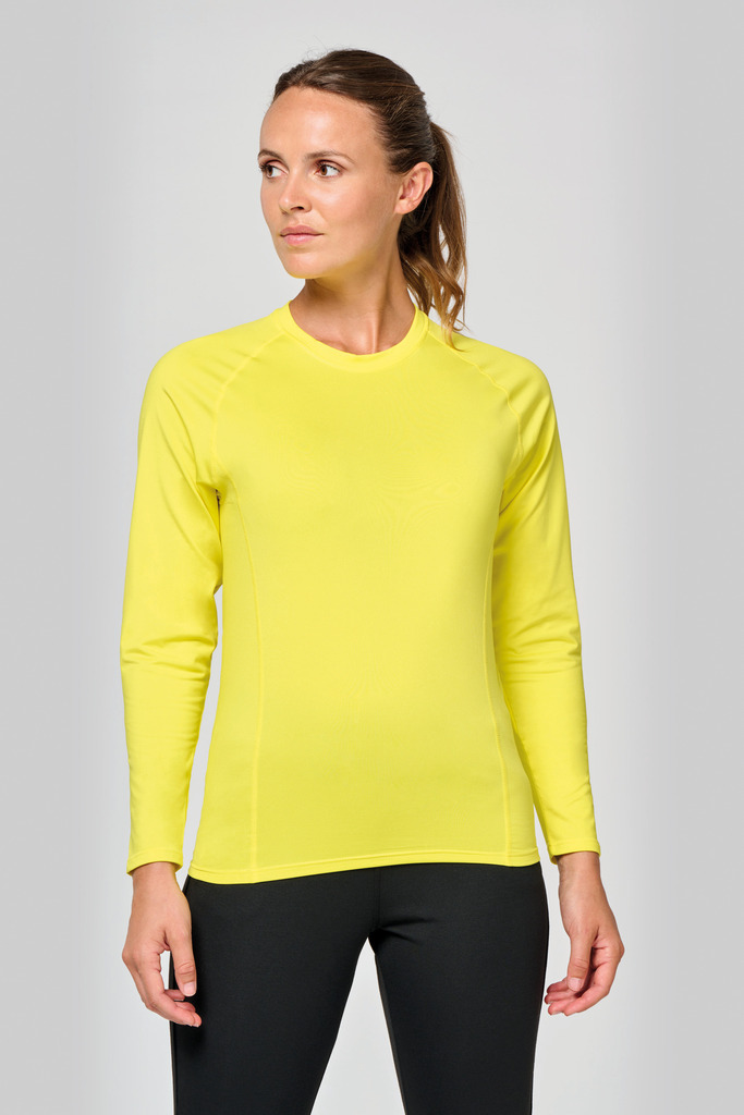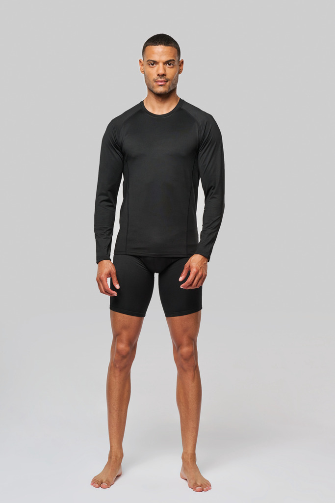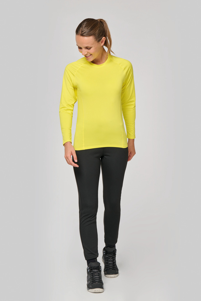 88% poliéster/12% elastano. Decote redondo. Pontos de recobrimento tom sobre tom. Acabamento costura dupla nas mangas e na bainha.
