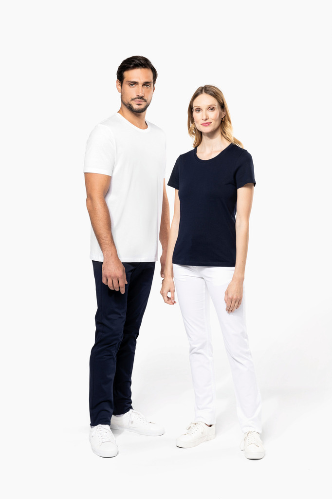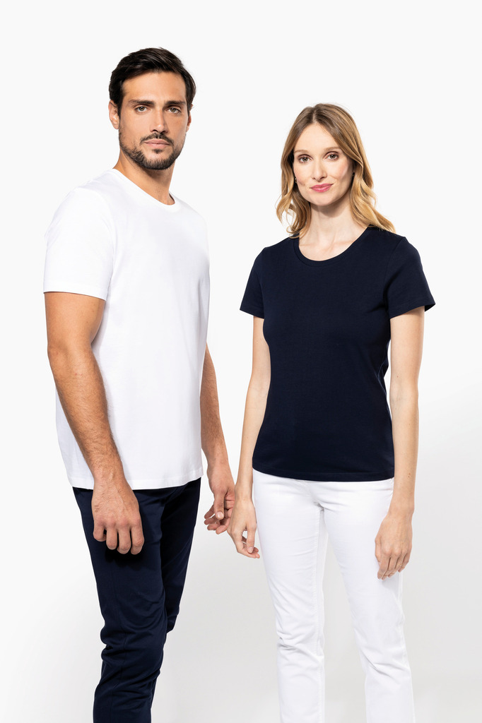 100% algodão. Malha em algodão penteado Supima®. Tecido jersey delicado e de grande qualidade com um toque suave e sedoso. Confecção corte e cose. Decote redondo com tapa costuras tom sobre tom. Reforço da costura dos ombros com banda de silicone. Acabamento da manga e da bainha com costura dupla. Sem etiqueta de marca no decote, contém apenas etiqueta com indicação de tamanho para facilitar a personalização.