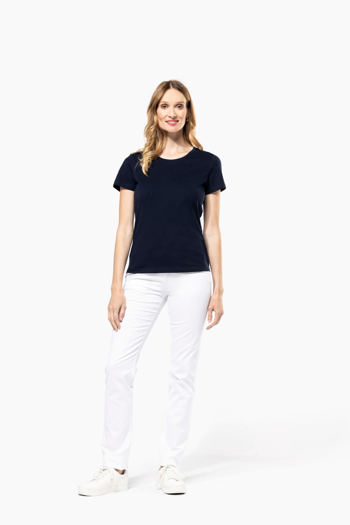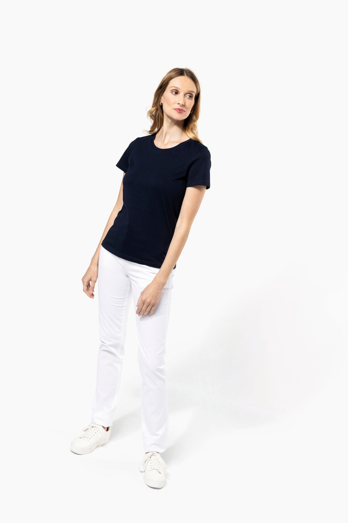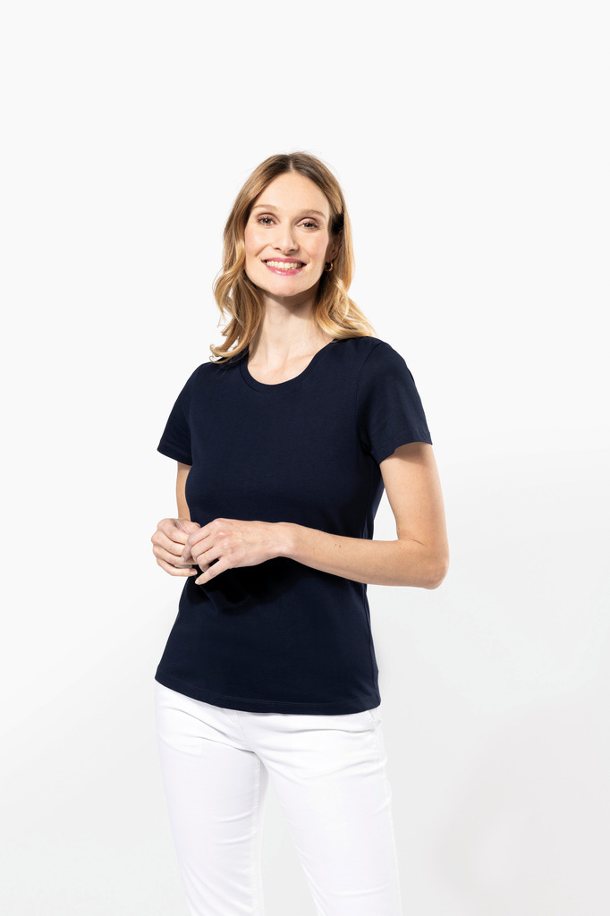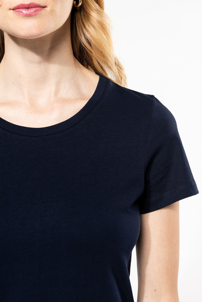100% algodão. Malha em algodão penteado Supima®. Tecido jersey delicado e de grande qualidade com um toque suave e sedoso. Confecção corte e cose. Decote redondo com tapa costuras tom sobre tom. Reforço da costura dos ombros com banda de silicone. Acabamento da manga e da bainha com costura dupla. Sem etiqueta de marca no decote, contém apenas etiqueta com indicação de tamanho para facilitar a personalização.