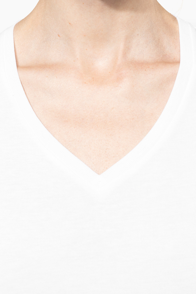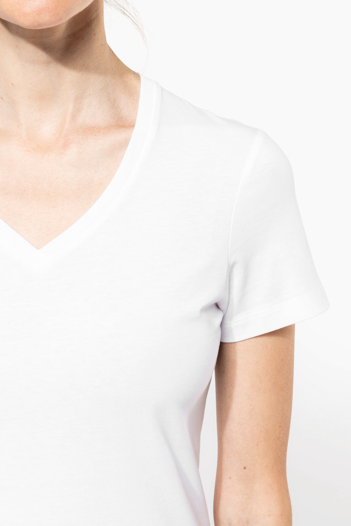 100% algodão. Malha em algodão penteado Supima®. Tecido jersey delicado e de grande qualidade com um toque suave e sedoso. Confecção corte e cose. Decote V com tapa costuras tom sobre tom. Reforço da costura dos ombros com banda de silicone. Acabamento da manga e da bainha com costura dupla. Sem etiqueta de marca no decote, contém apenas etiqueta com indicação de tamanho para facilitar a personalização.