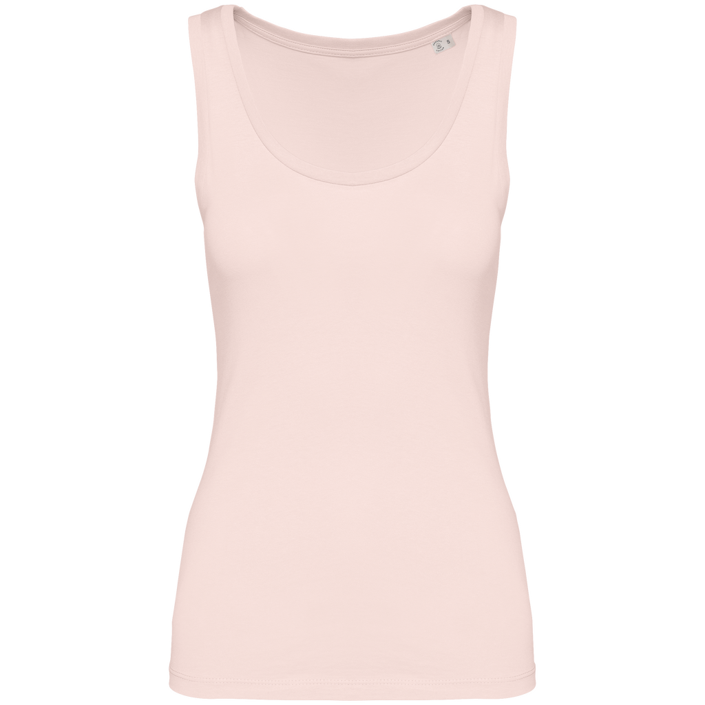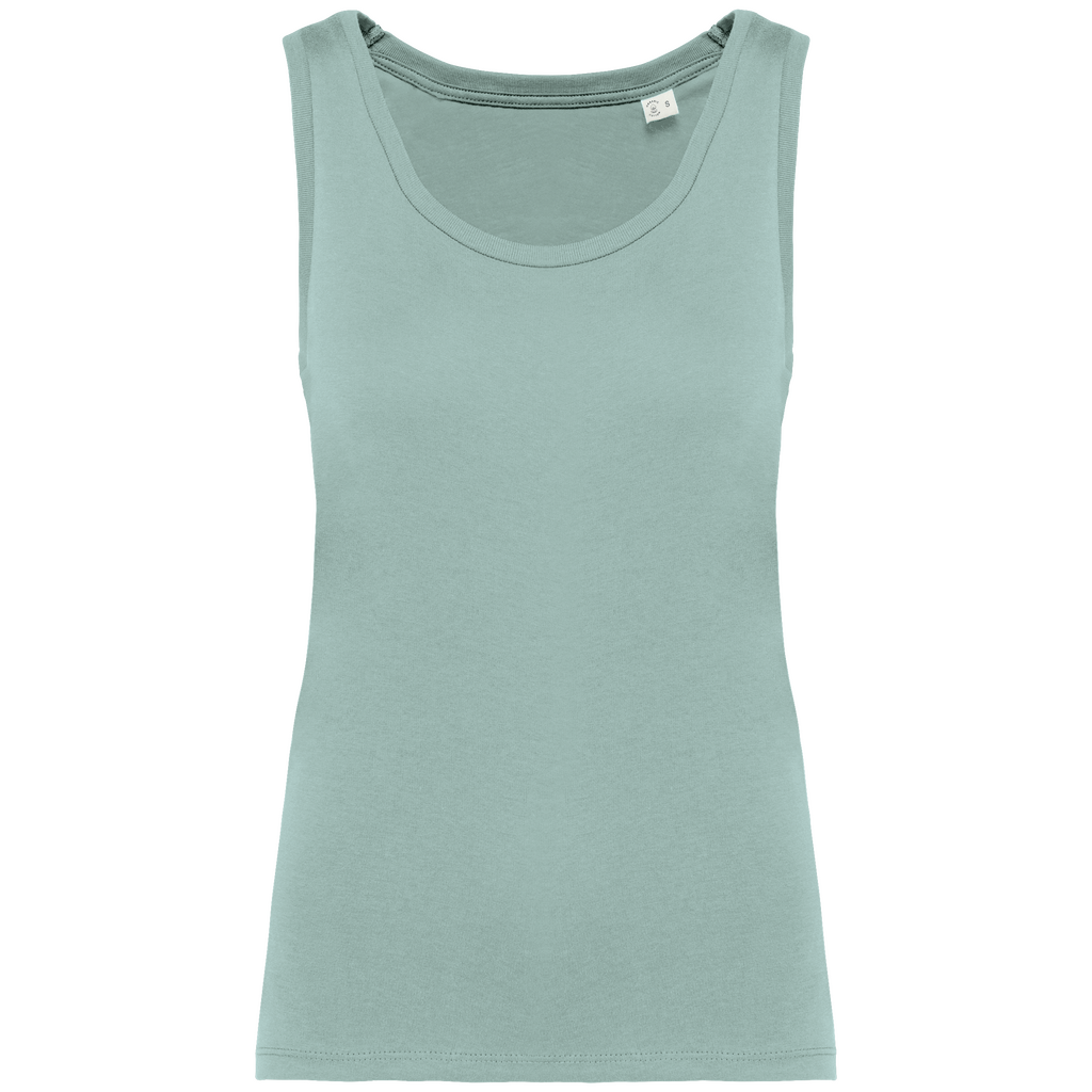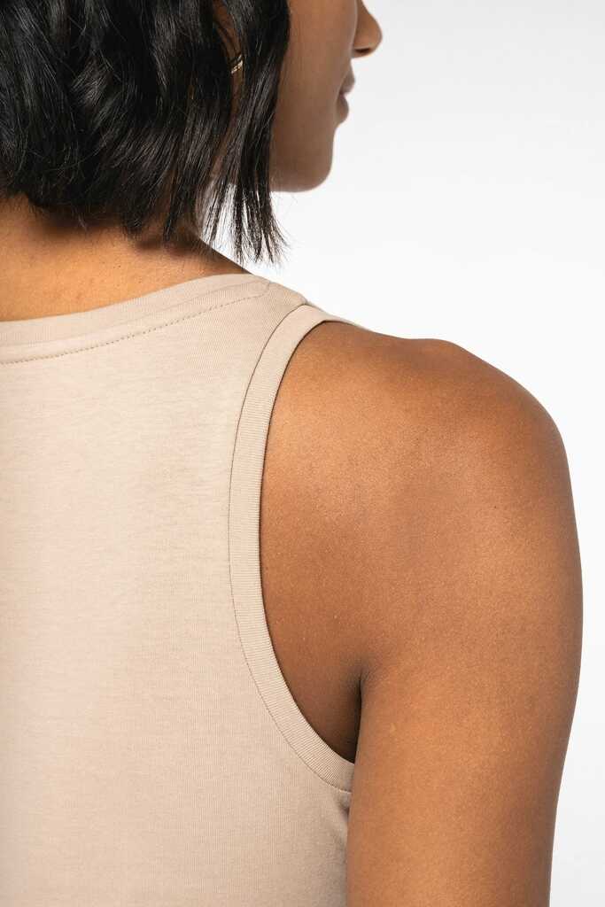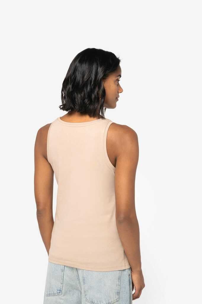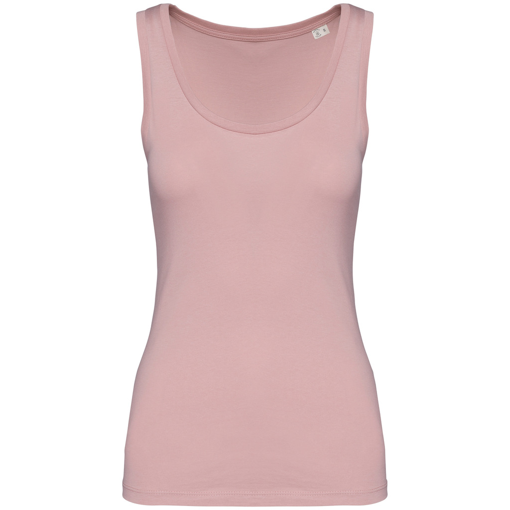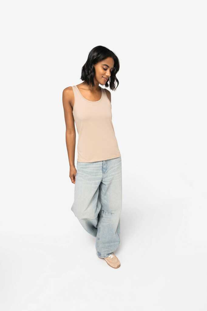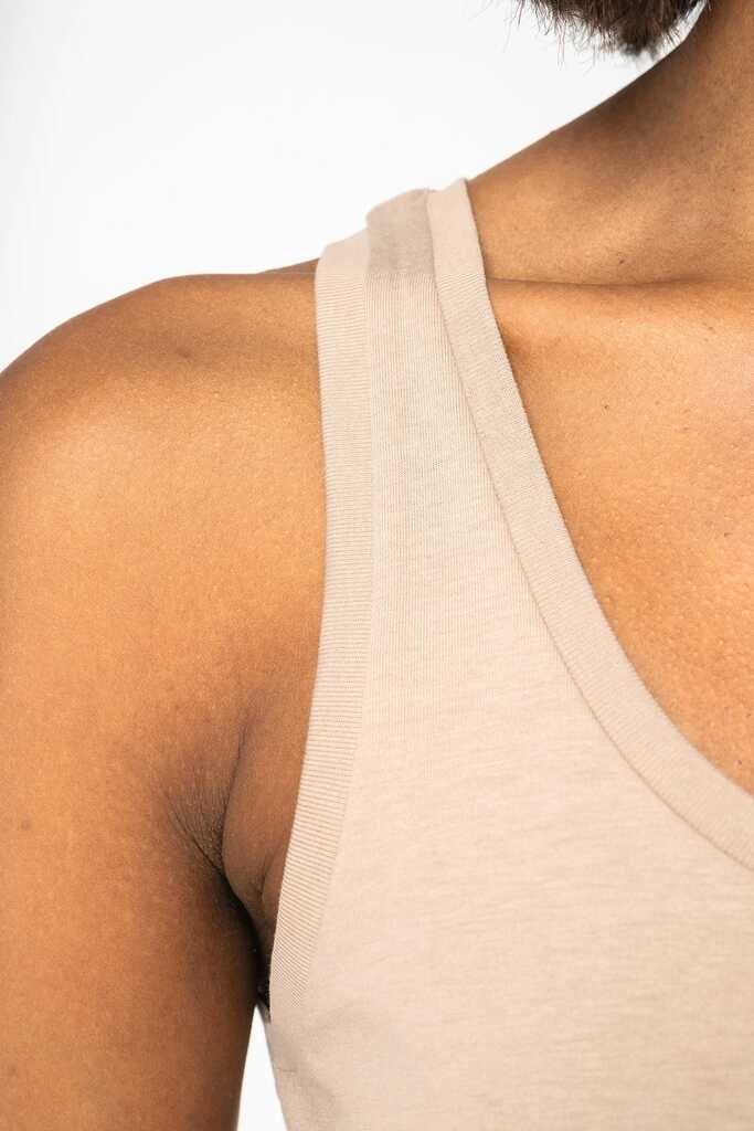 100% algodão biológico. Algodão penteado ringspun. Corte justo. Costuras laterais. Decote e cavas em malha rib 1 x 1. Tapa-costuras no interior do decote no material principal. Bainha com costura dupla no cós.
