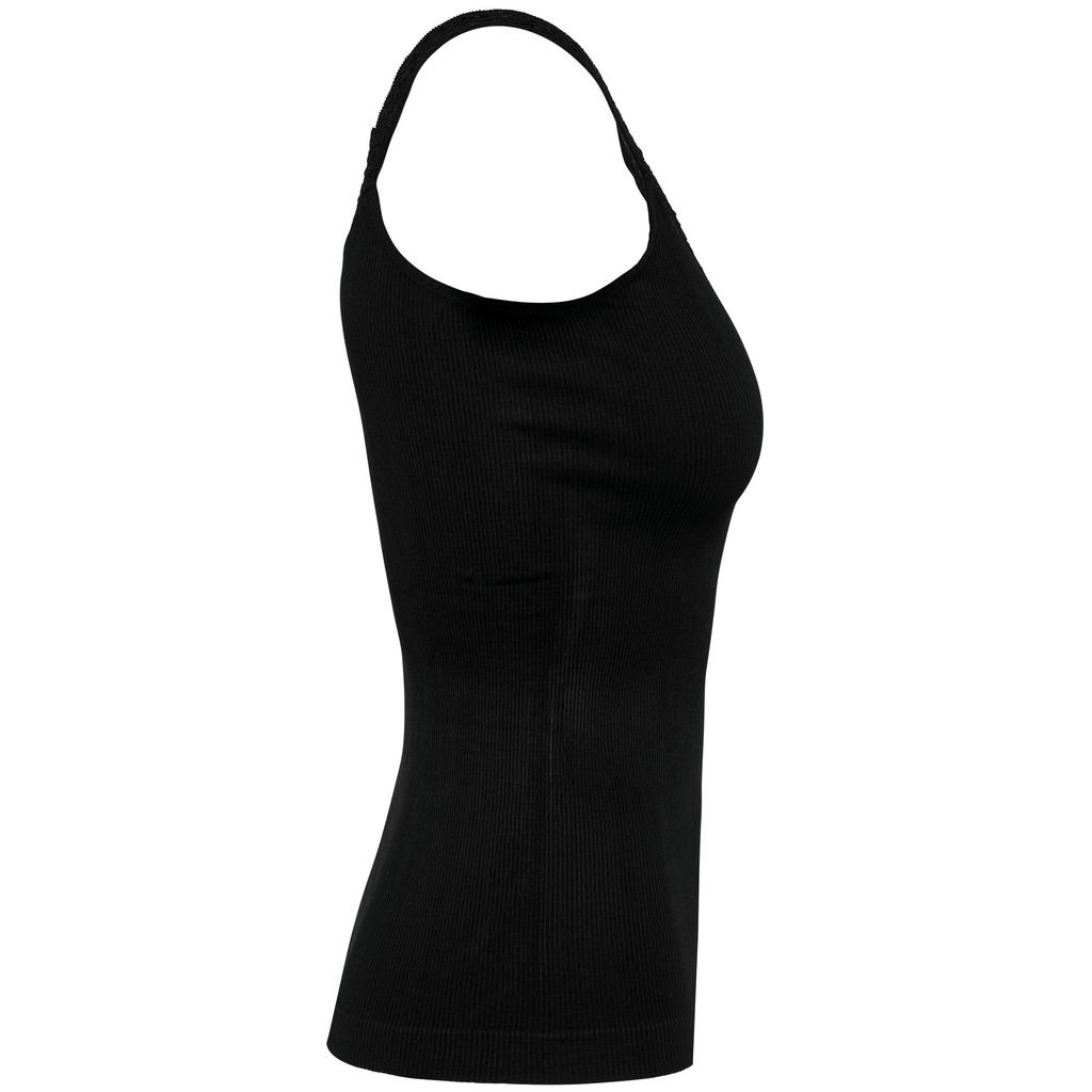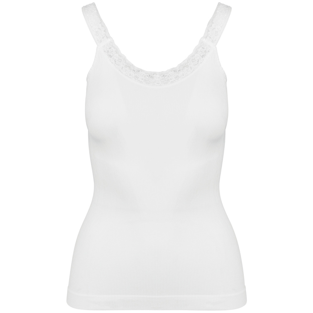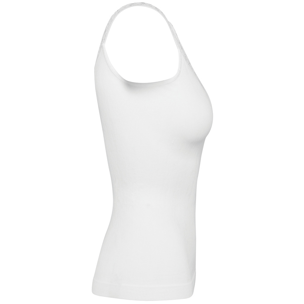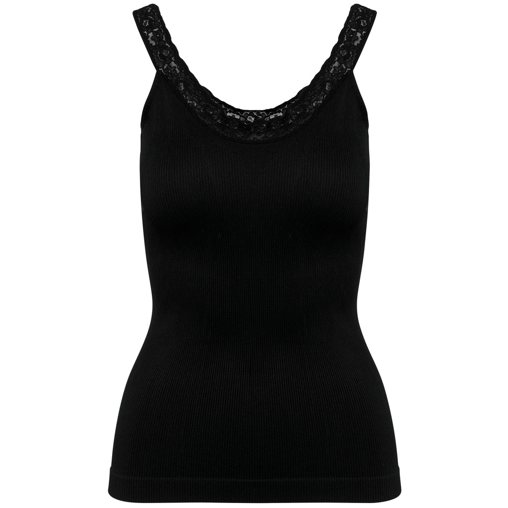 98% poliamida / 2% elastano. Concebido a partir de 85% poliamida reciclada pré-consumer. Fio Q-NOVA®. Malha rib 2 x 2. Corte justo. Sem costuras. Alças, decote frontal e das costas em renda. Acabamento da cava com debrum. Bainha com costura invisÃvel. Etiqueta da marca Tear Away.