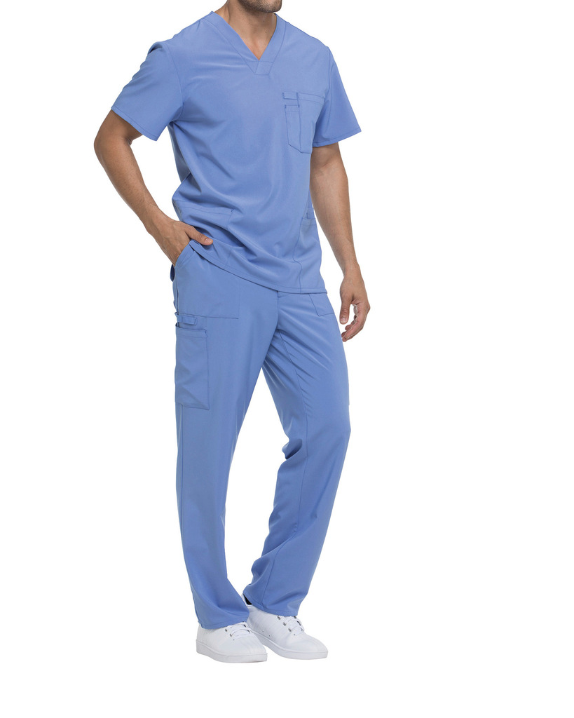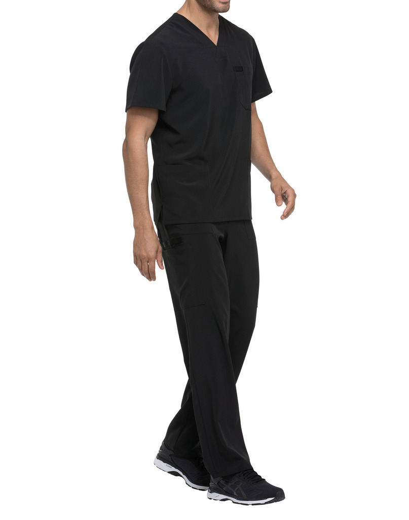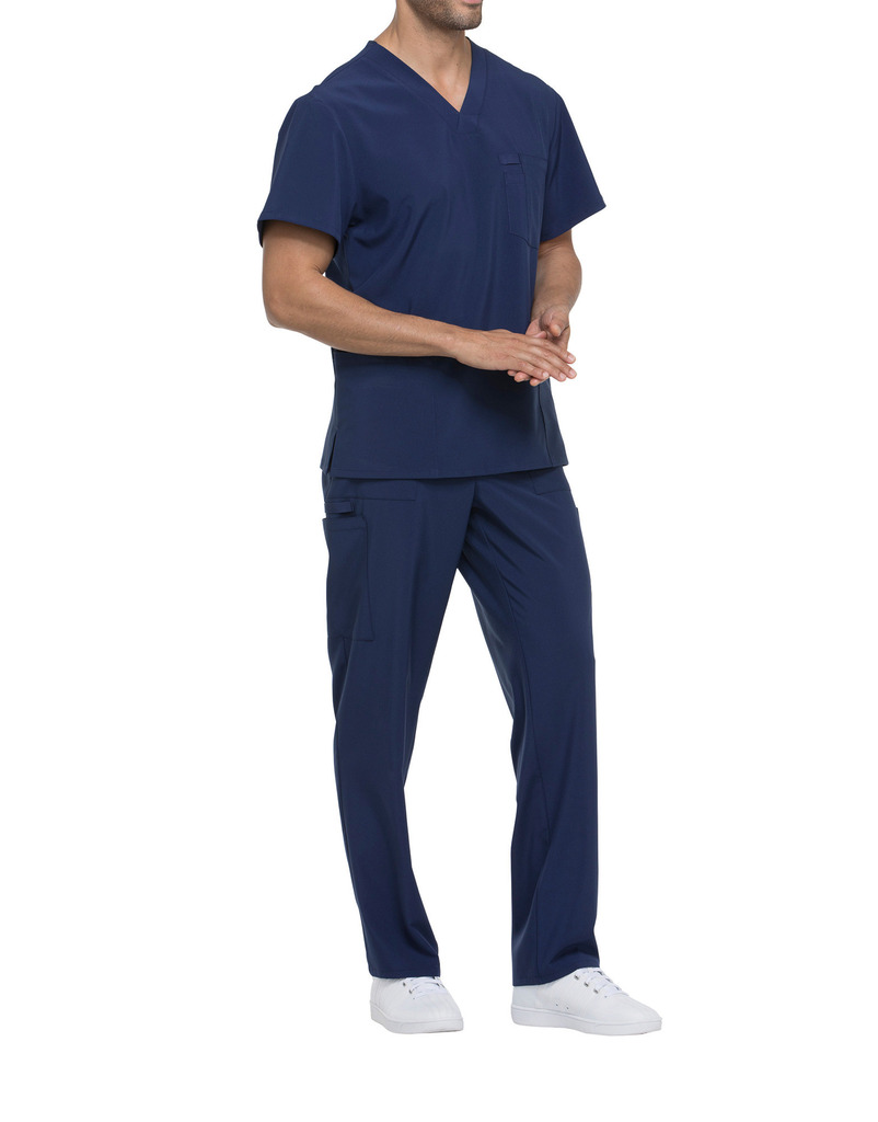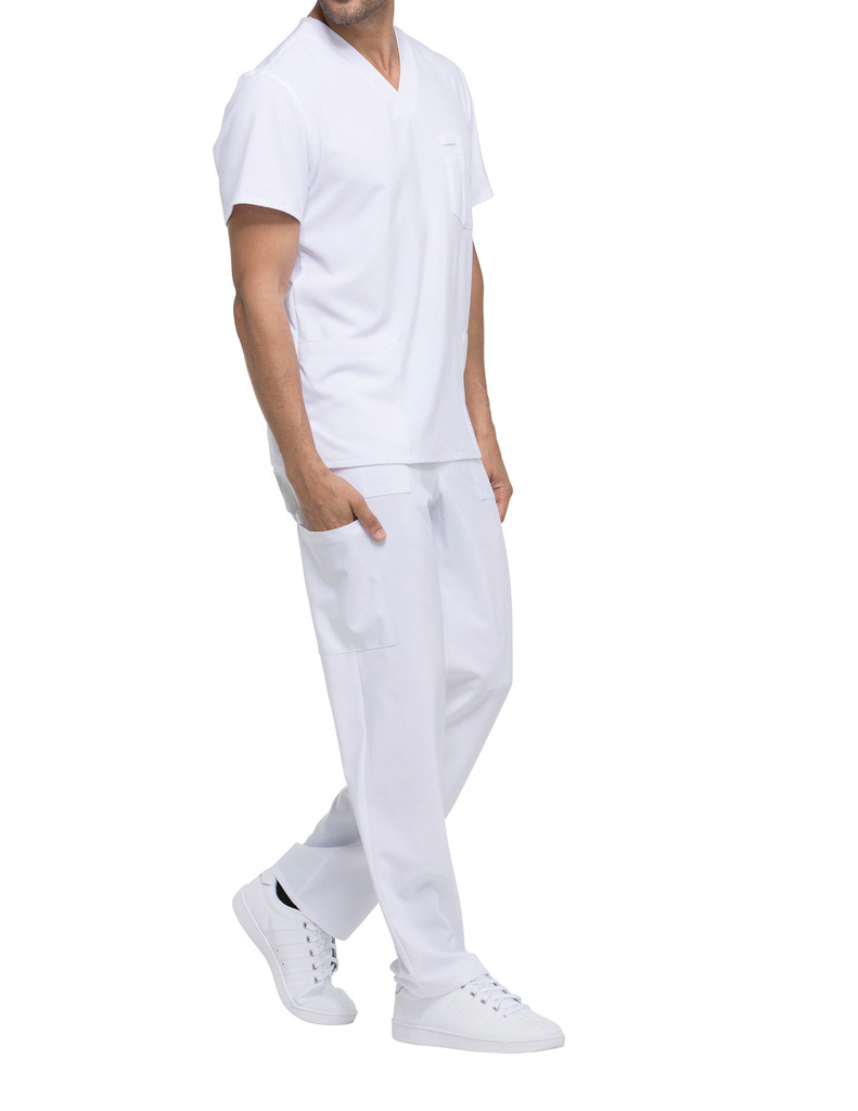 95% poliéster/5% elastano. Corte masculino. Quatro bolsos: bolsos planos, bolso no peito com abertura para caneta, bolso acessório. Presilhas para instrumentos em sarja no peito direito. Etiqueta tecida tom sobre tom. Tapa costuras com logotipo da marca no interior do decote. Aberturas laterais.