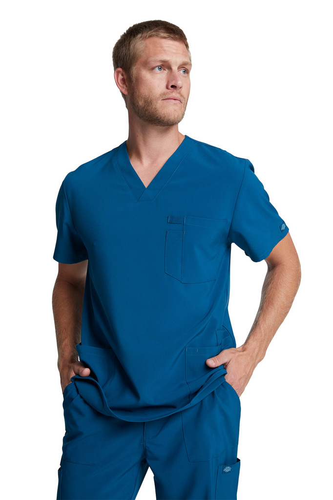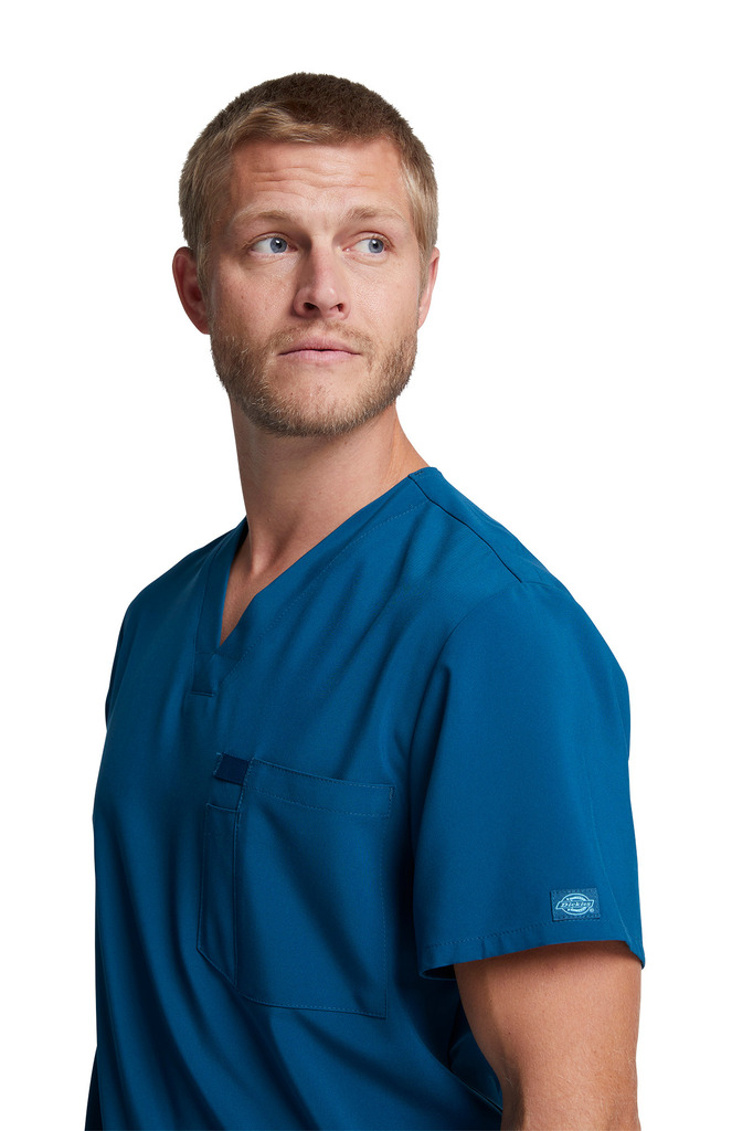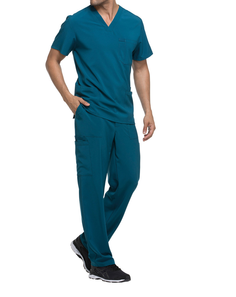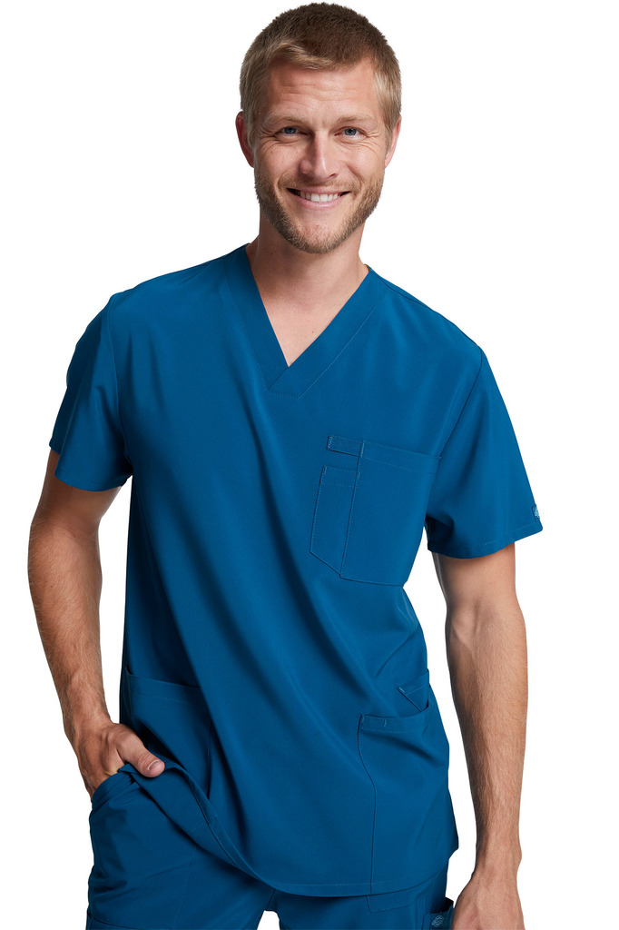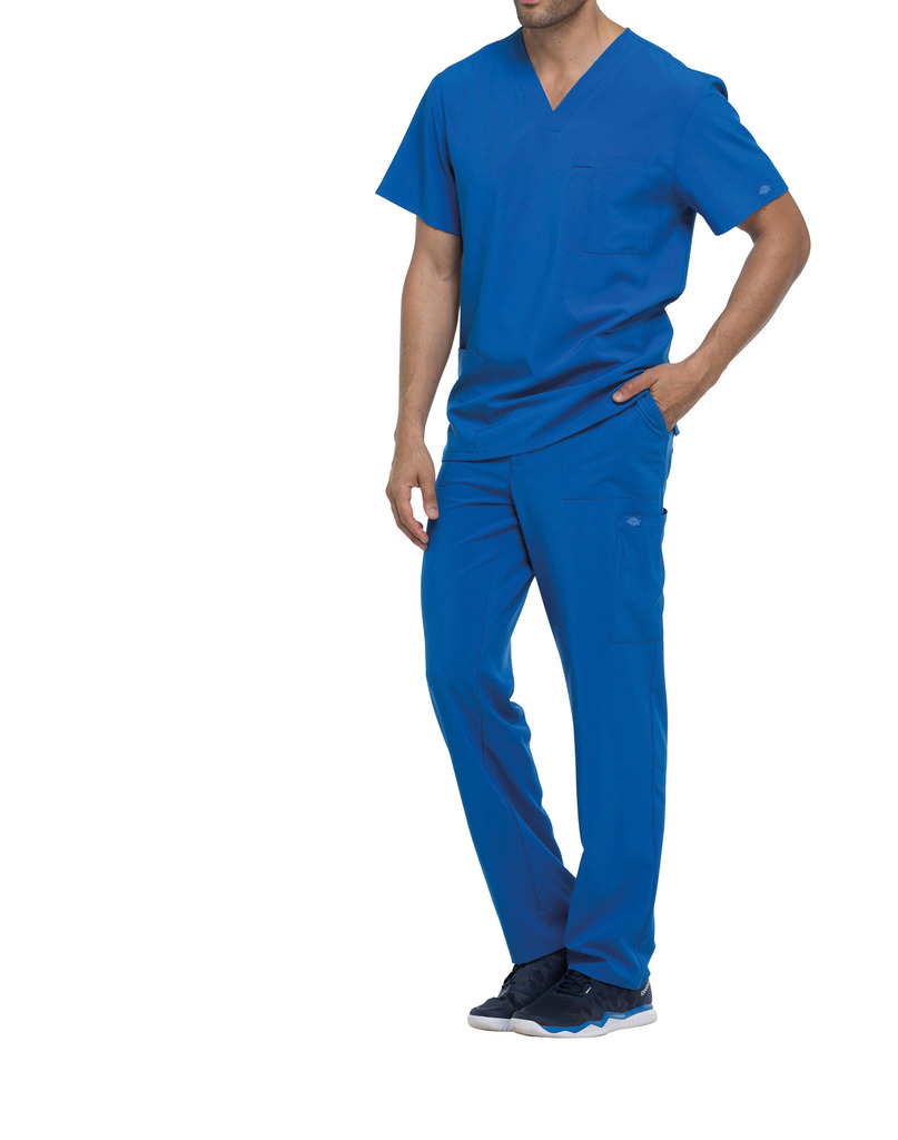 95% poliéster/5% elastano. Corte masculino. Quatro bolsos: bolsos planos, bolso no peito com abertura para caneta, bolso acessório. Presilhas para instrumentos em sarja no peito direito. Etiqueta tecida tom sobre tom. Tapa costuras com logotipo da marca no interior do decote. Aberturas laterais.