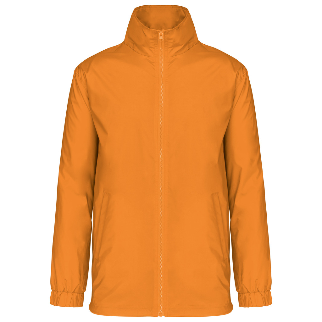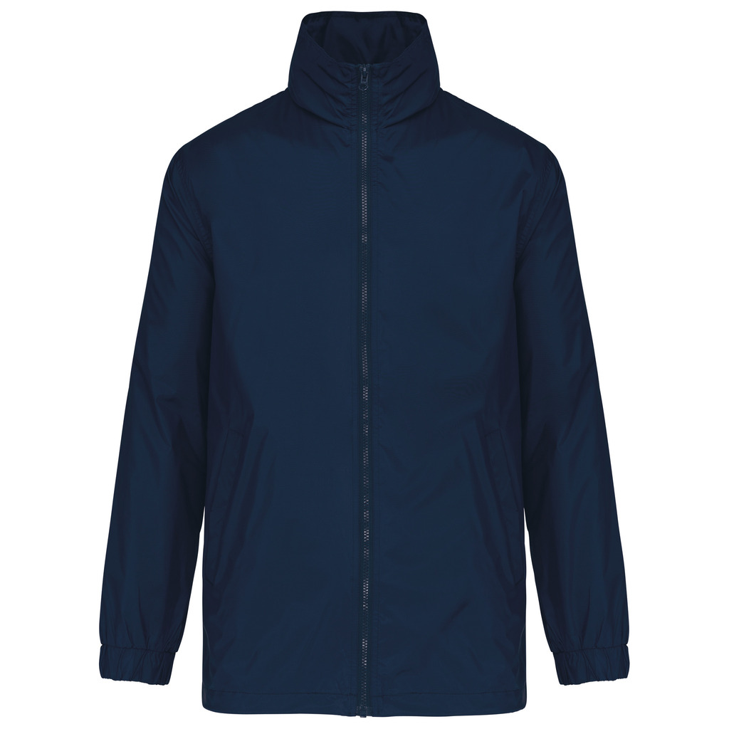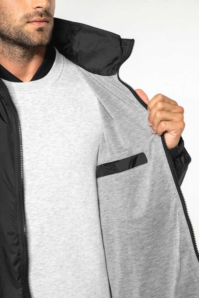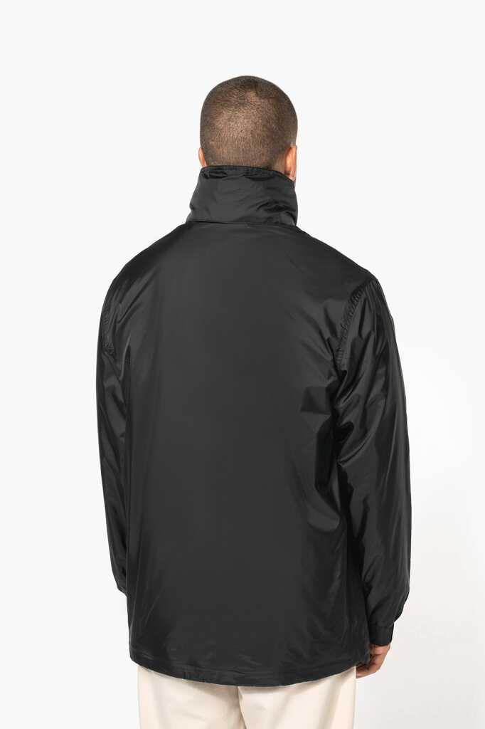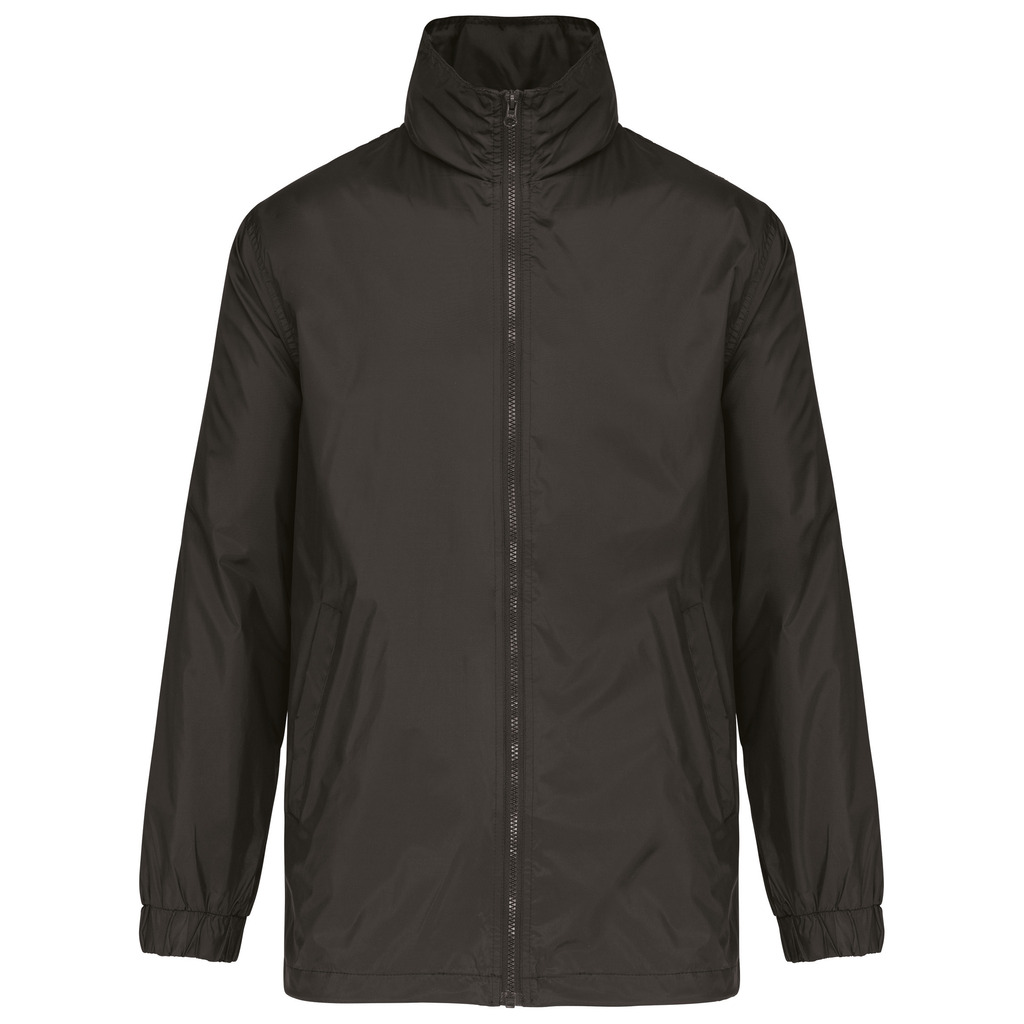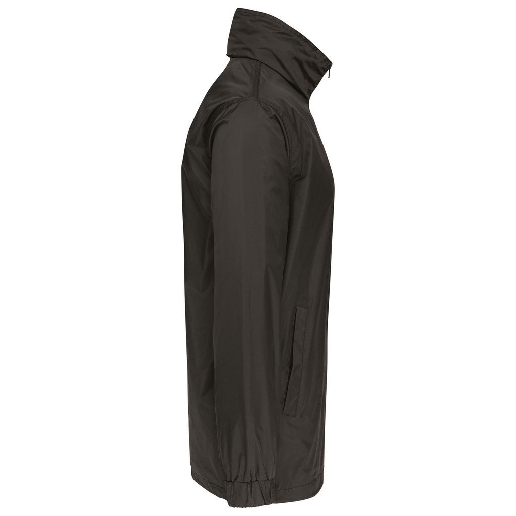 100% poliamida 210T com revestimento acrÃlico. Forro em malha poliéster cinzenta. Capuz no interior da gola. Fecho frontal. 1 bolso interior + 2 bolsos frontais. Cordão elástico na cintura. Fecho de acesso para personalização.