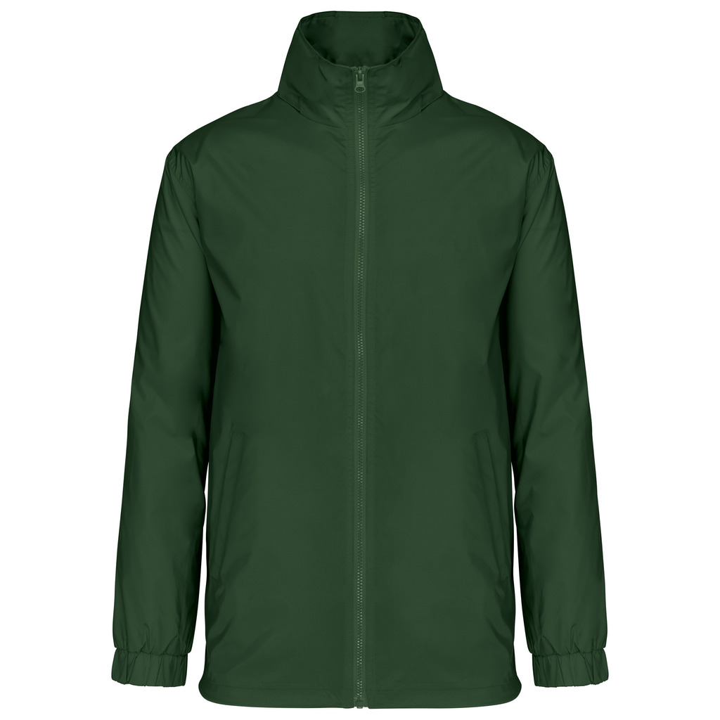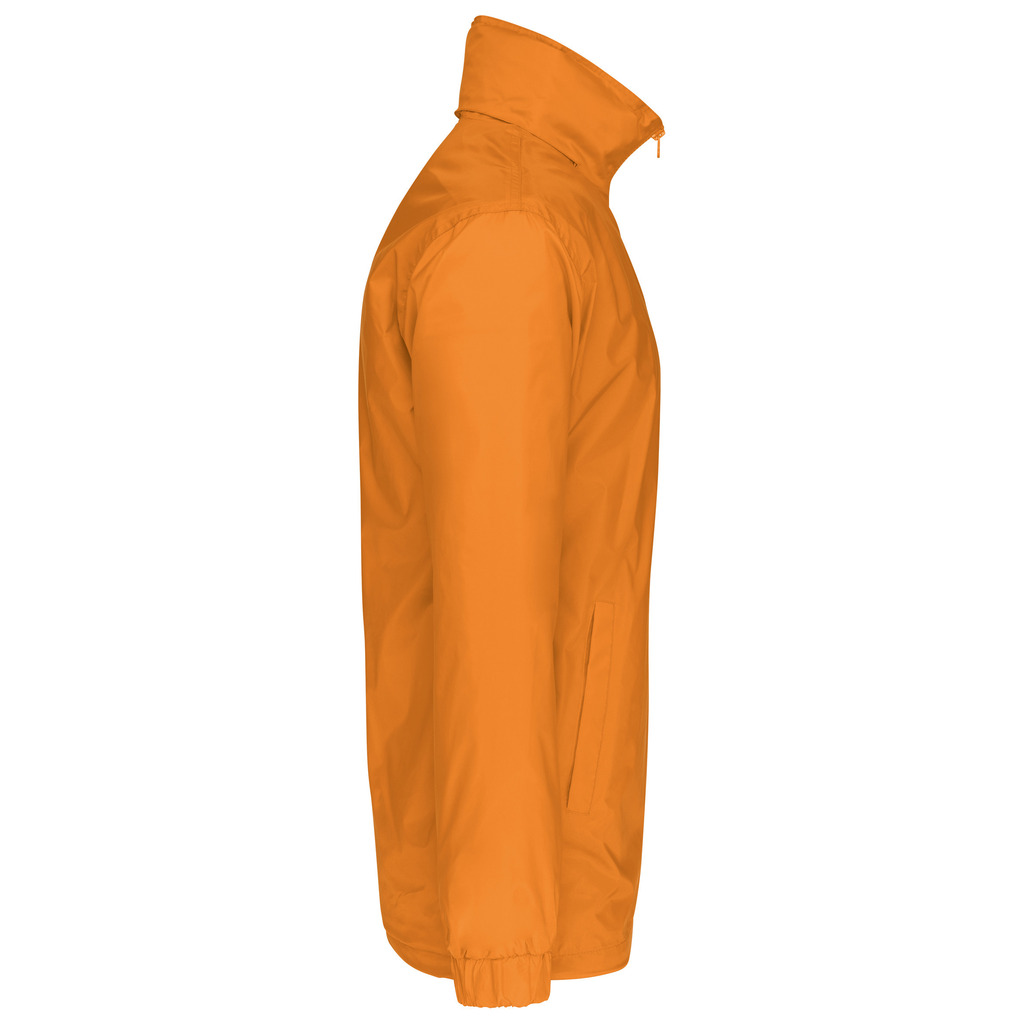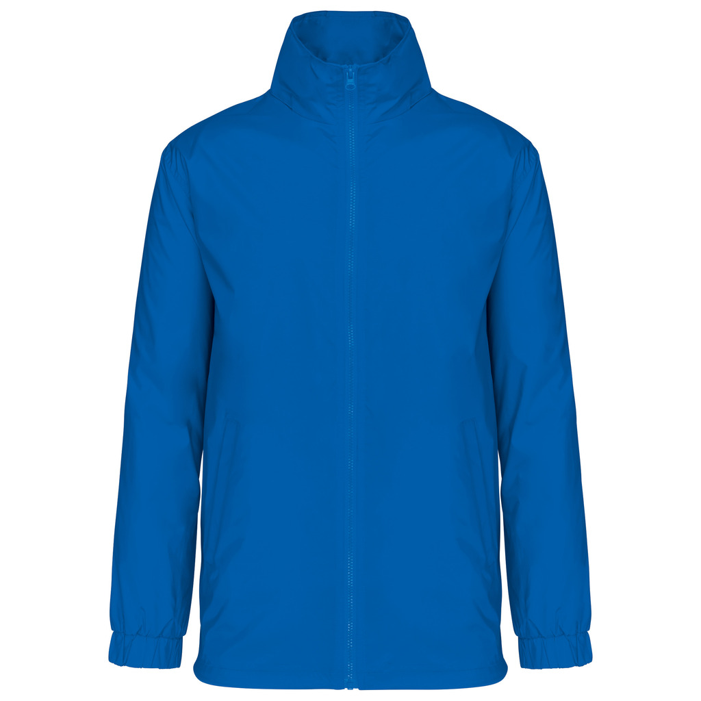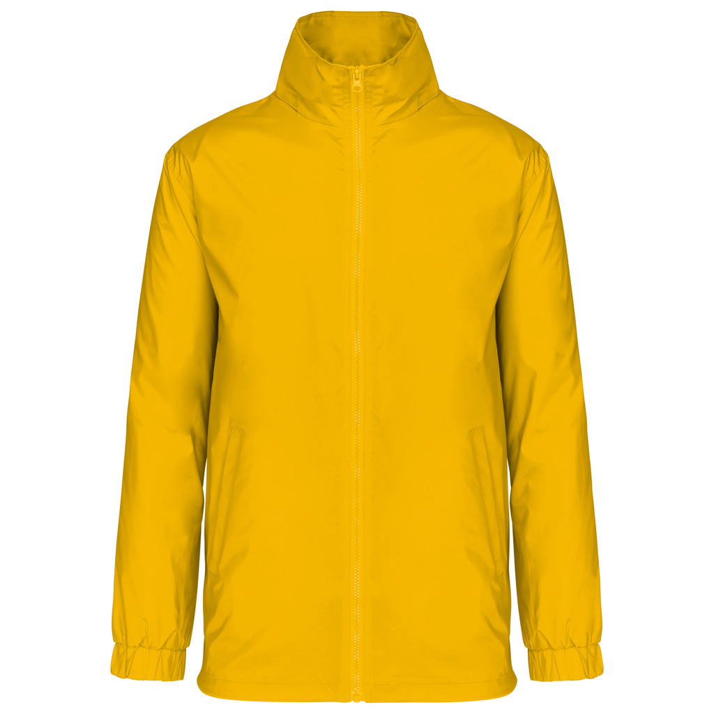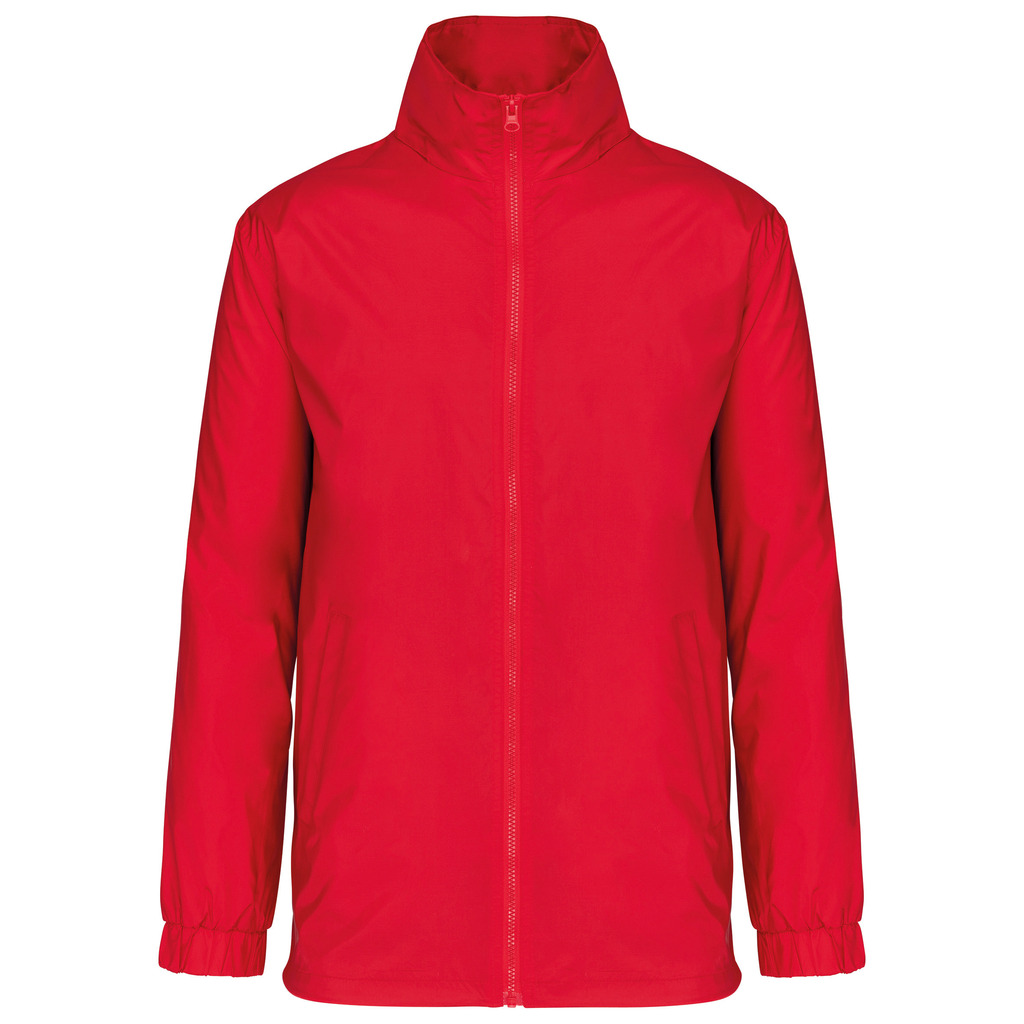 100% poliamida 210T com revestimento acrÃlico. Forro em malha poliéster cinzenta. Capuz no interior da gola. Fecho frontal. 1 bolso interior + 2 bolsos frontais. Cordão elástico na cintura. Fecho de acesso para personalização.